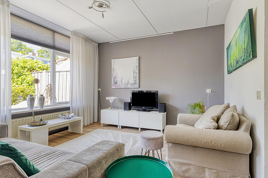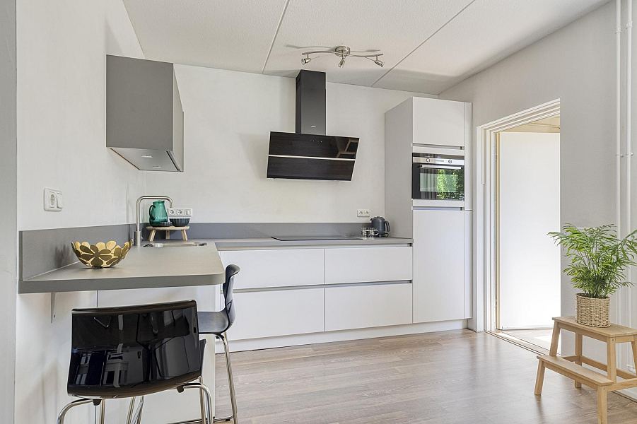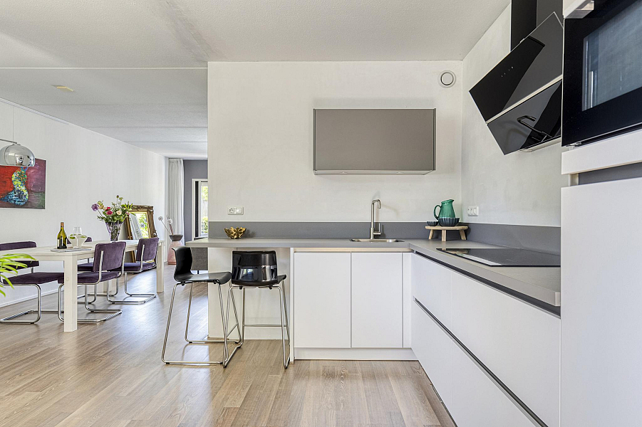 BEGANE GROND: Entree met meterkast, straatgerichte, moderne open keuken (2020) met inbouwapparatuur (o.a. inductiekookplaat, afzuigkap met recirculatie, vaatwasser, combi-oven en koelkast), de woonkamer biedt door de grote raampartij mooi zicht op de achtergelegen diepe tuin, vanuit de woonkamer is er een tussenhal met toiletruimte en trapopgang naar de 1e verdieping..