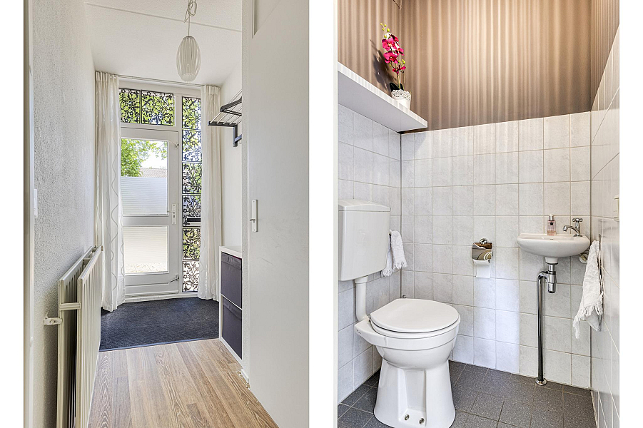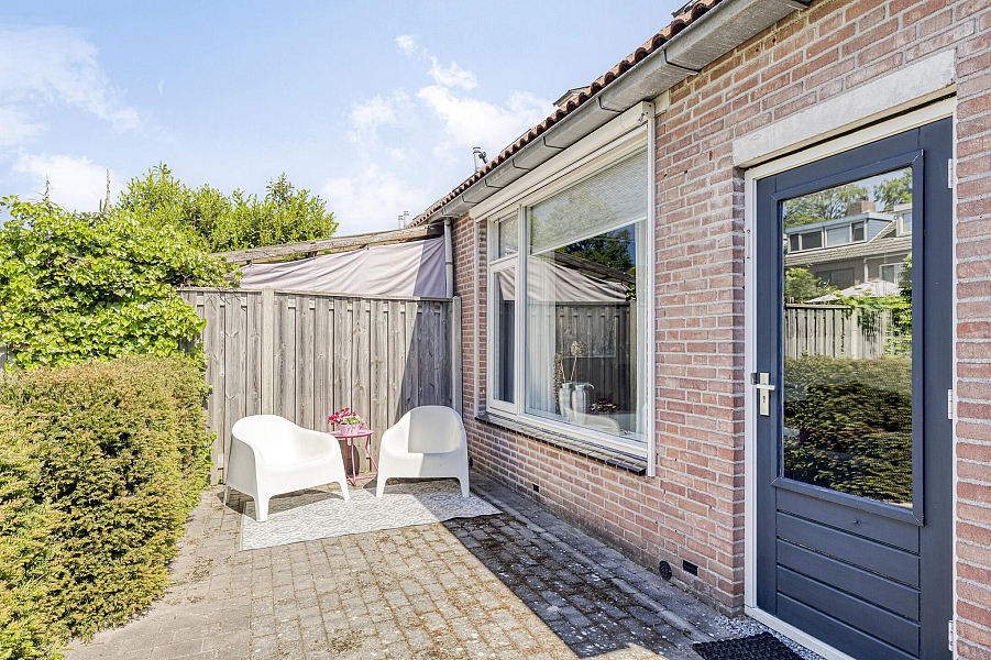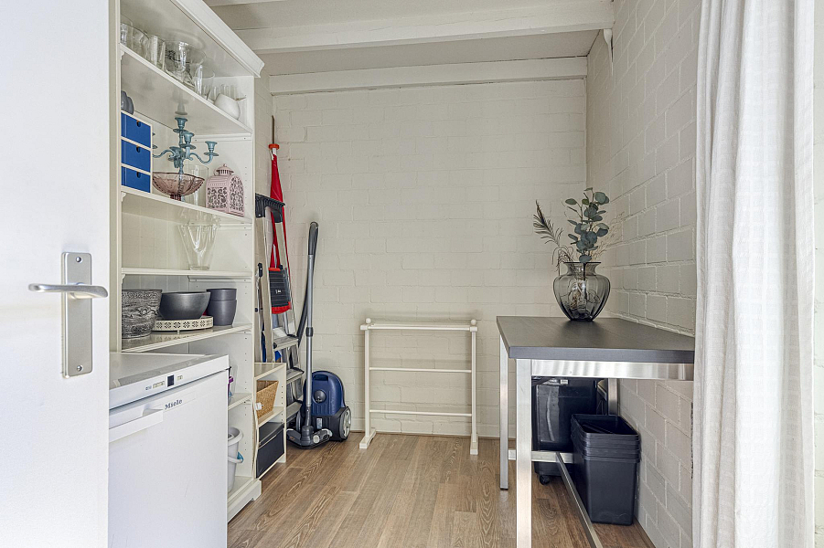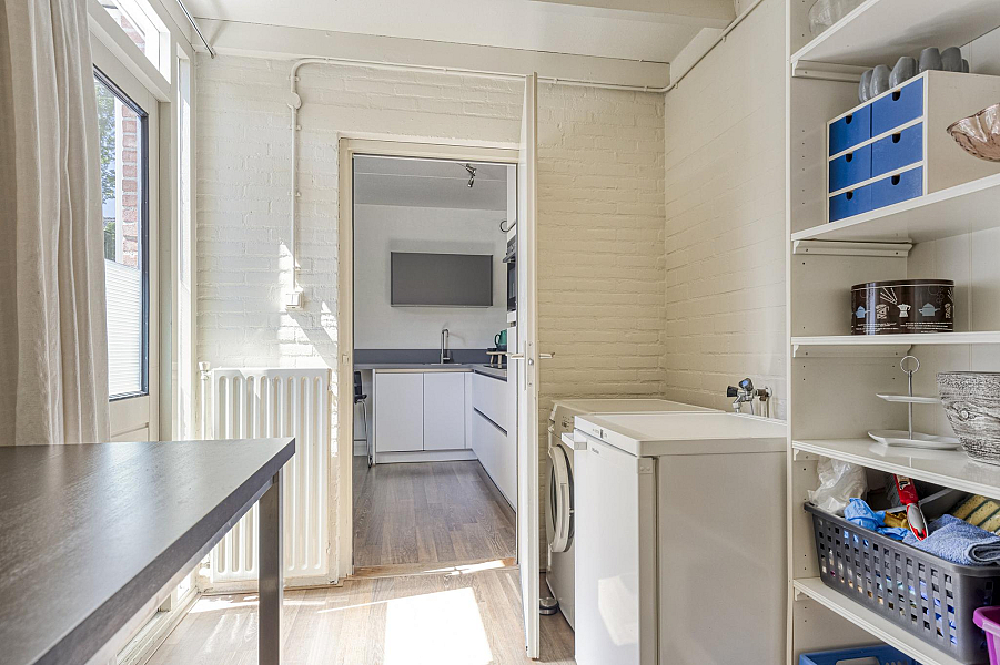 Aan de voorzijde bevindt zich nog een praktische bijkeuken/berging met opstelplaats voor de wasmachine, en een overdekte fietsenstalling.