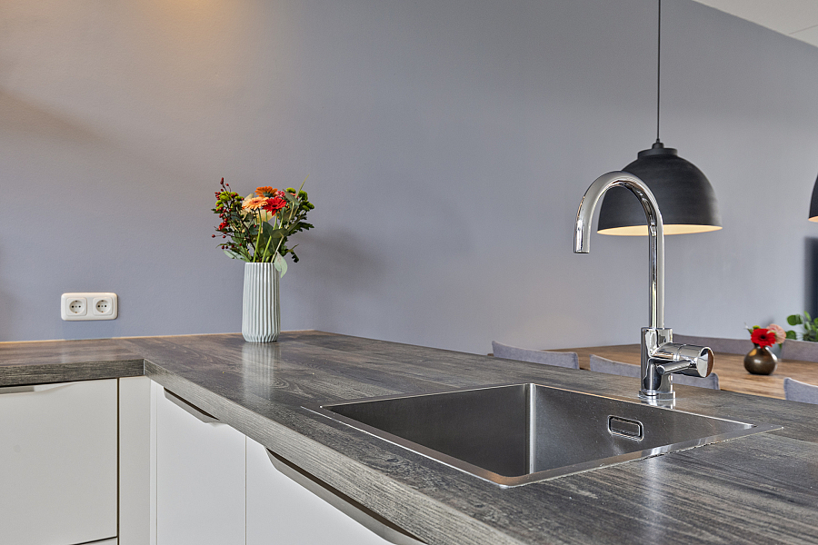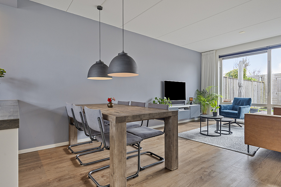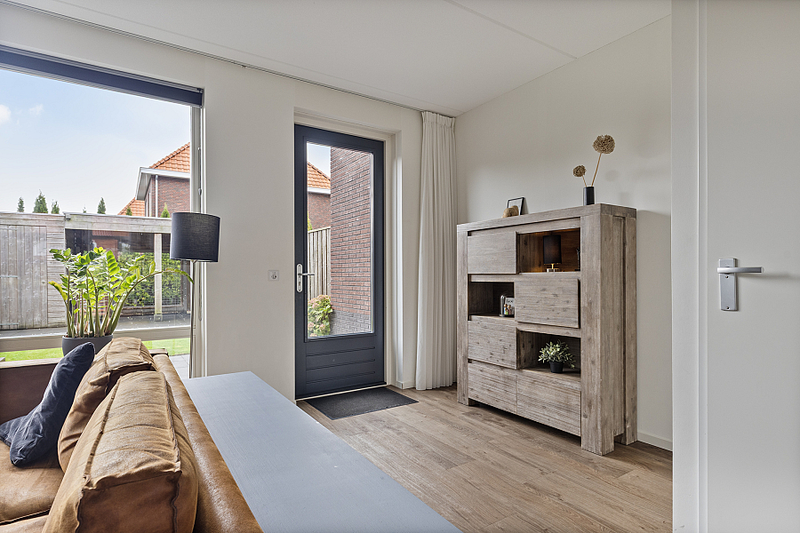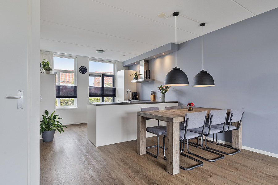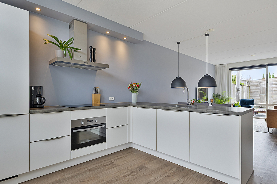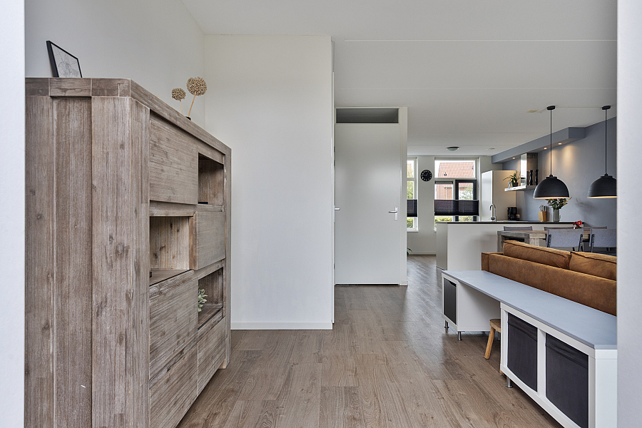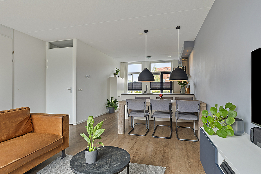 Bij binnenkomst valt direct de ruime en lichte woonkamer op. De strakke PVC-vloer met vloerverwarming/vloerkoeling loopt drempelloos door over de gehele begane grond, wat zorgt voor een moderne uitstraling en aangenaam wooncomfort. De open keuken is voorzien van diverse inbouwapparatuur en vormt een gezellige plek in de woning, ideaal voor wie graag kookt of samenkomt met familie en vrienden.