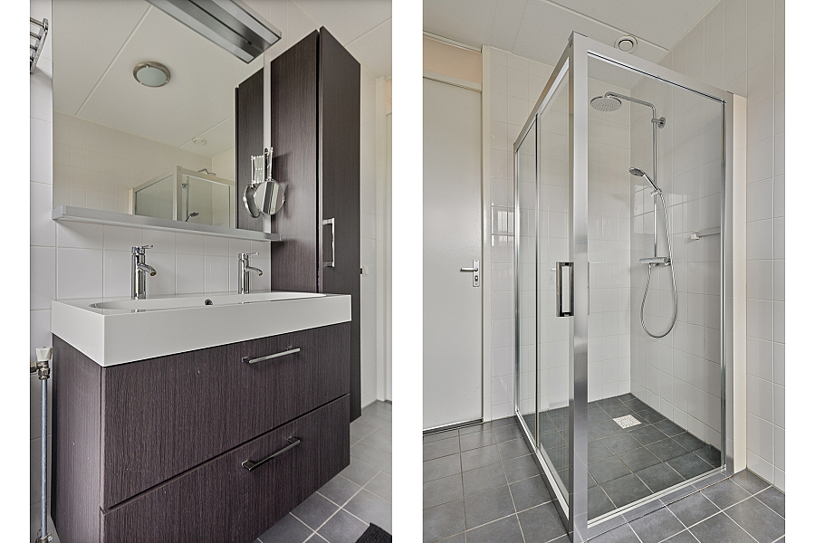 Op de eerste verdieping bevinden zich drie slaapkamers en een moderne badkamer met douche, dubbele wastafel en toilet. Ook hier ligt in de slaapkamers een prachtige PVC-vloer met vloerverwarming/vloerkoeling, wat zorgt voor een luxe en warme uitstraling.
