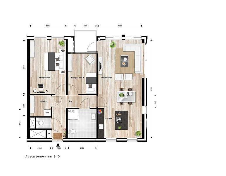 Entree met de meterkast, de toiletruimte voorzien van toilet en luxe tegelwerk, de inpandige berging met wasmachine aansluiting, 2 slaapkamers (groot resp. 17m2 en 11m2), de badkamer is eveneens voorzien van luxe wand,- en vloertegels, toilet en draingoot. Er is ervoor gekozen om de wastafel te laten vervallen. Uiteraard worden de aansluitpunten voor warm,- en koudwater en de afvoer wel aangebracht waardoor je de mogelijkheid hebt hier naar eigen wens en smaak een mooi wastafelmeubel te laten plaatsen.