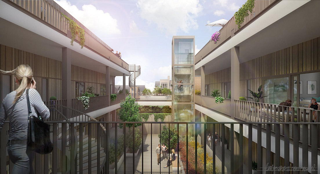 Grote ramen zorgen voor veel daglicht. De woningen zijn georiënteerd op een groene buitenruimte; de voormalige aula wordt getransformeerd naar een gezamenlijke tuin. Hier wordt tevens een gezamenlijke fietsenberging voor de appartementen gesitueerd. Voor de 14 appartementen zijn 17 parkeerplaatsen beschikbaar.