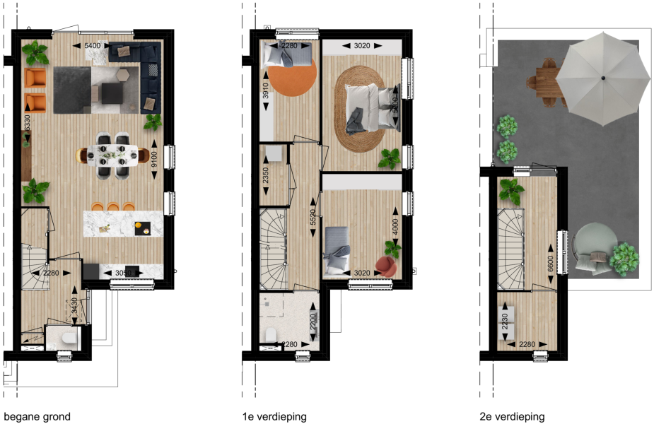 De rij woningen kent een bijzondere architectuur, geïnspireerd op de naastgelegen monumenten. Iedere woning bestaat uit drie bouwlagen. Door de verhoogde vloer op de begane grond heeft u veel privacy aan de straatkant. Centraal middelpunt in de woning is de keuken; deze verbindt de eetkamer (voorzijde) en de woonkamer (achterzijde). Iedere woning beschikt over een grote, nader in te delen zolder, een tuin met berging en eigen carport. Lees hier meer over de architectuur van het gebouw.