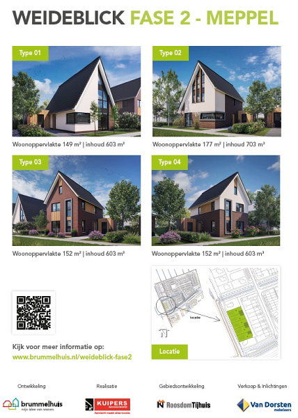 Weideblick is een water- en groenrijke wijk waar je elke dag kunt genieten van de prachtige omgeving en je eigen vrijstaande woning. Op de vrijstaande kavels met nummers 123 tot en met 127 aan de Westergrift heeft Brummelhuis 5 verschillende woningtypen ontwikkeld die op deze kavels gebouwd mogen worden.