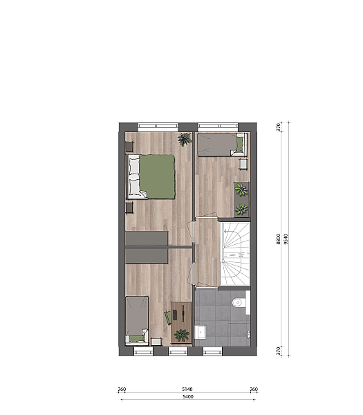 De eerste verdieping van deze woning heeft drie slaapkamers en een badkamer met een douche, een wastafel en een tweede wandcloset. Op zolder staan de technische installaties. In de ruimte waar de aansluiting van de wasmachine is, zou je ook opbergkasten en een strijkplank kwijt kunnen. Daarnaast kun je optioneel kiezen voor bijvoorbeeld nog een extra slaapkamer.