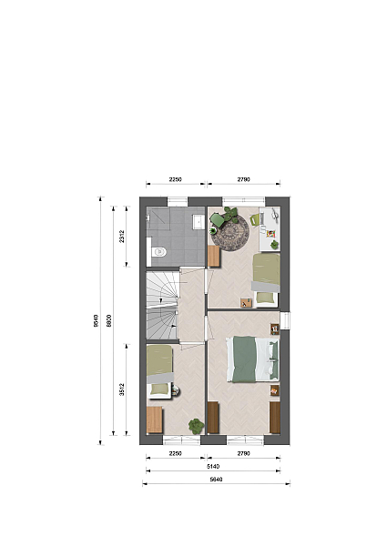 De eerste verdieping van deze woning heeft drie slaapkamers en een badkamer met een douche, een wastafel en een tweede wandcloset. Wil je iets wijzigen op de verdieping? Er is veel mogelijk! Op zolder staan de technische installaties. In de ruimte waar de aansluiting van de wasmachine is, zou je ook opbergkasten en een strijkplank kwijt kunnen. Daarnaast kun je optioneel kiezen voor bijvoorbeeld nog twee extra slaapkamers.