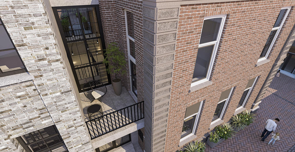 balkon en op de tweede verdieping de slaapkamers en badkamer. Via een looppad in het tussenlid wordt maisonnette G bereikt, die uitkijkt over de Hoofdstraat. Op de eerste verdieping bevinden zich de woonkamer, keuken en balkon en op de tweede verdieping de slaapkamer en badkamer.