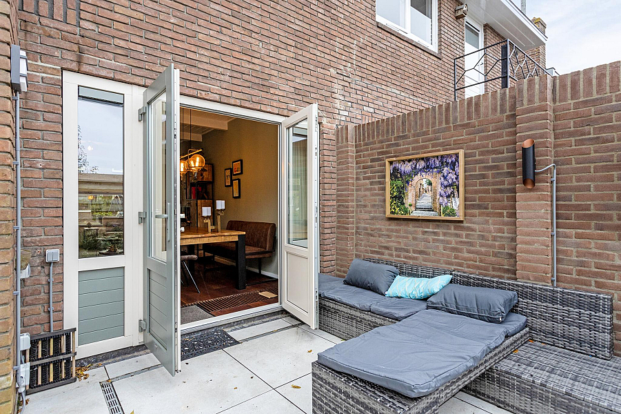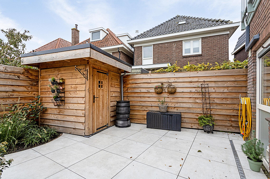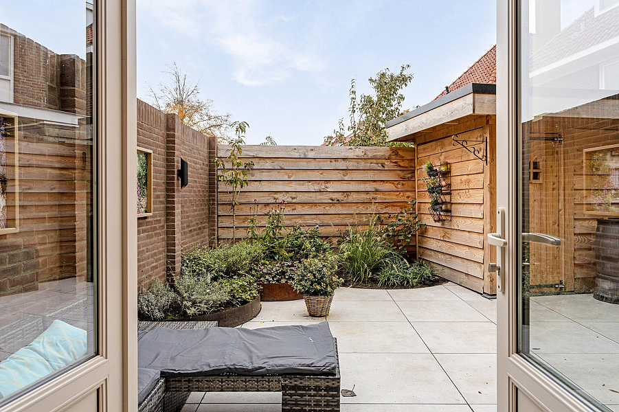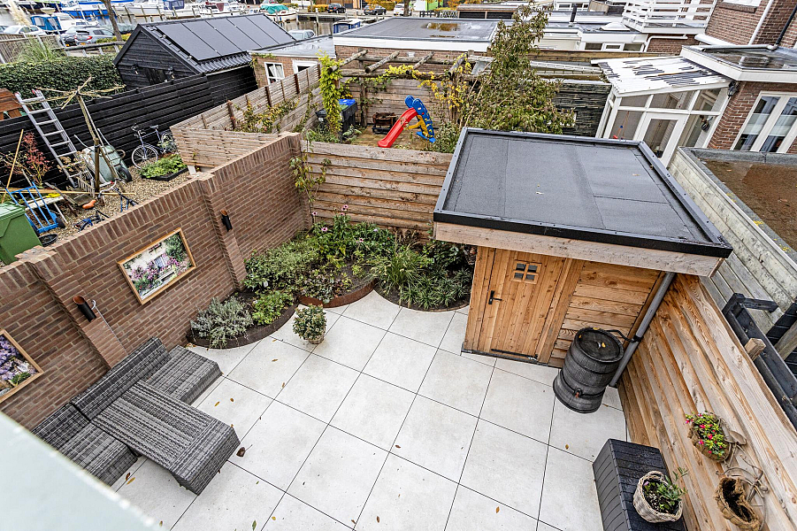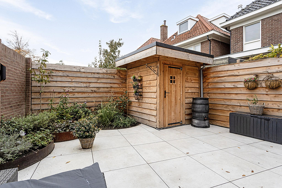 De fraai aangelegde stadstuin is voorzien van een recente houten berging en is ook via een achterom bereikbaar.