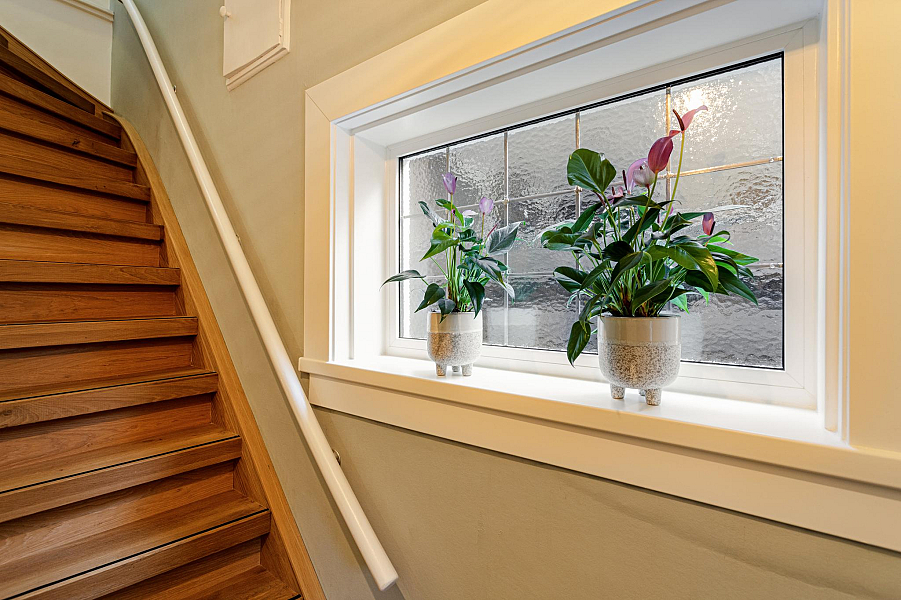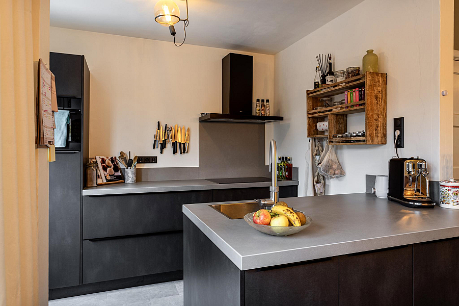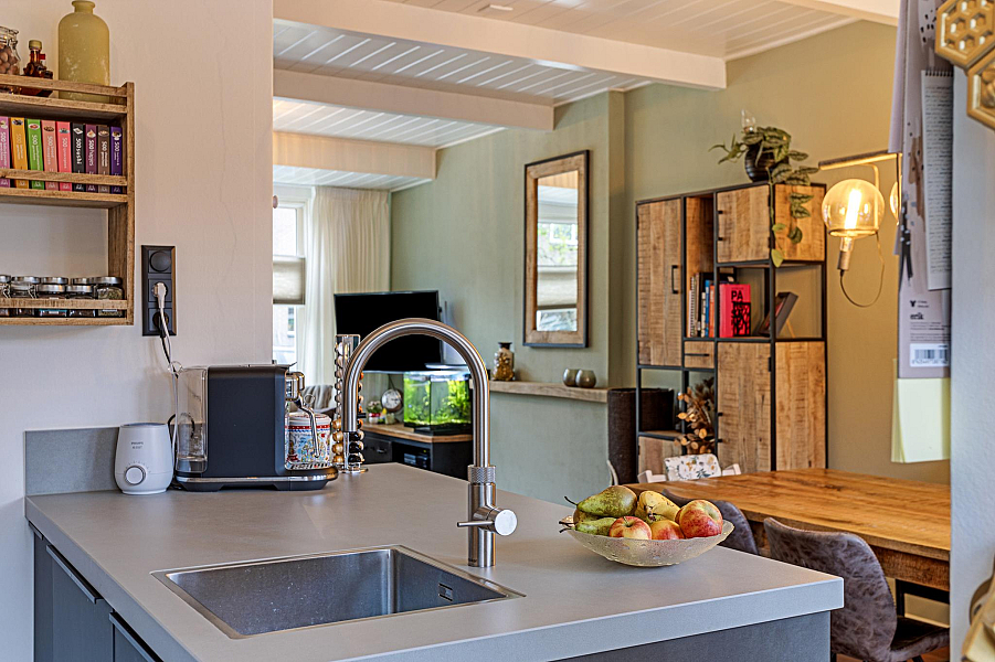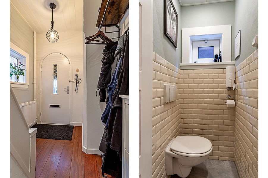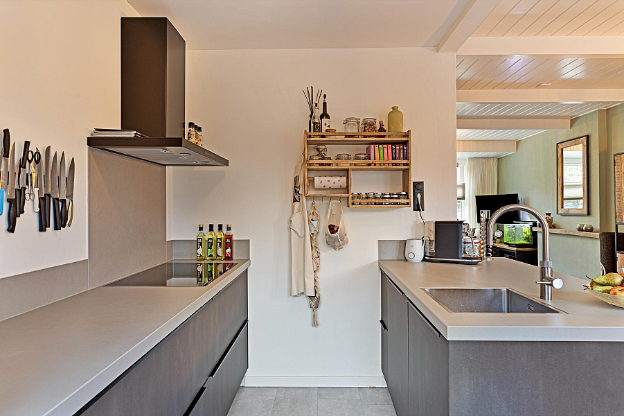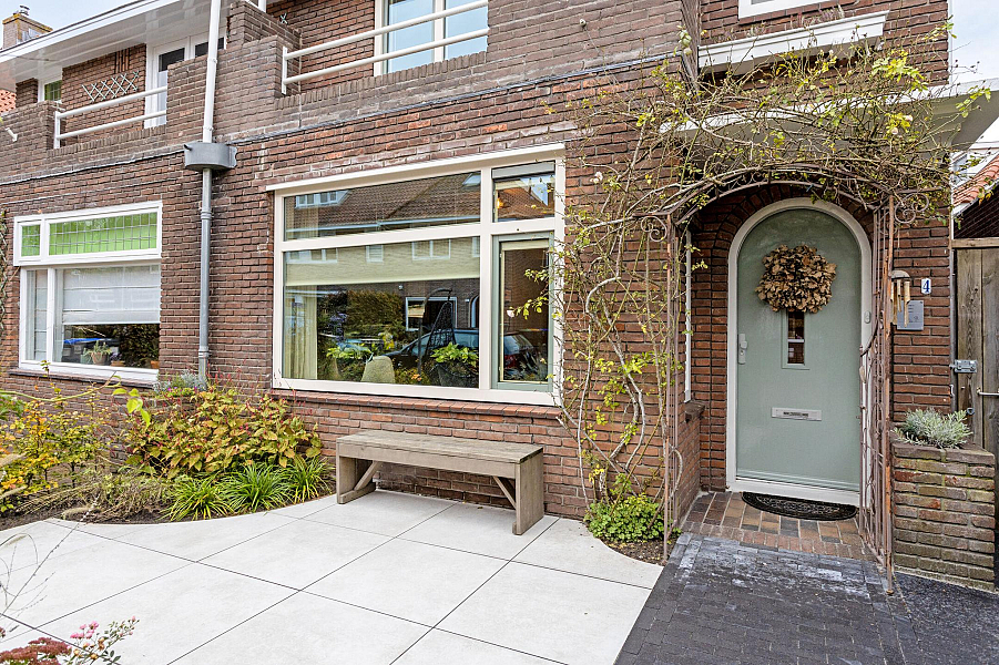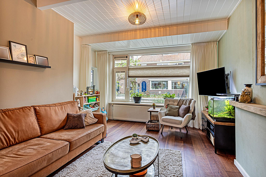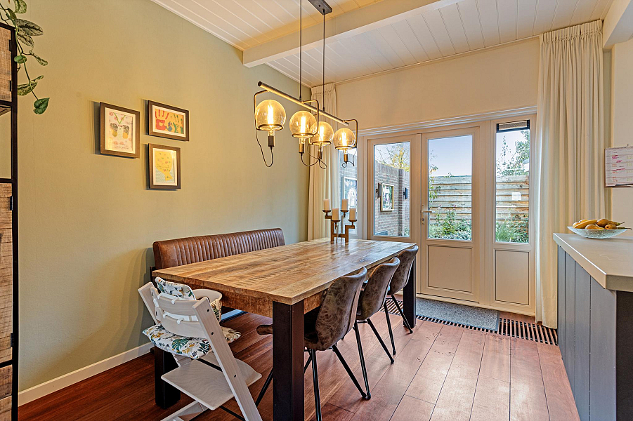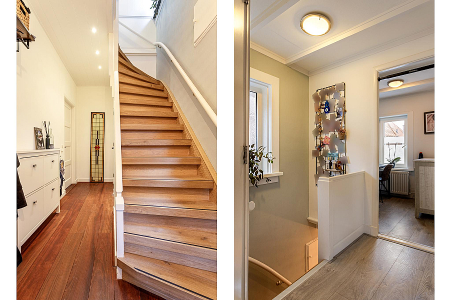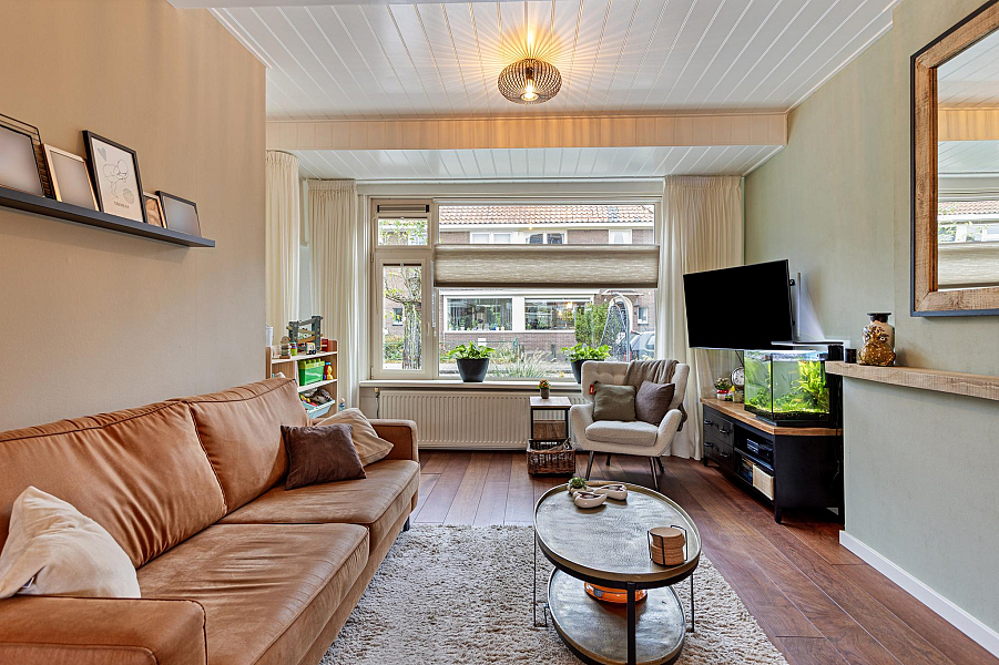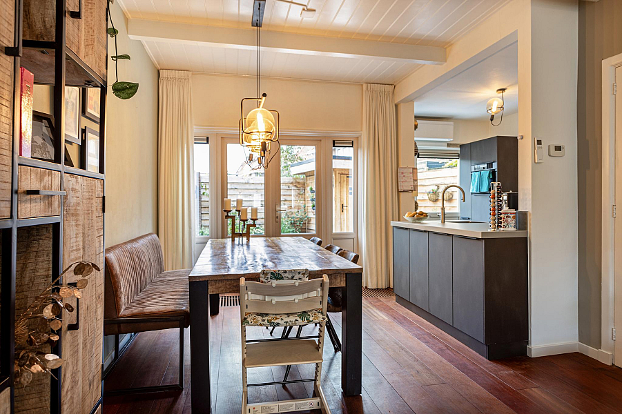 BEGANE GROND: Entree/hal met fraaie deur en glas-in-lood raam, kelderkast, toiletruimte met hangend toilet, lichte woonkamer door de grote raampartijen met Jatoba vloer, erker aan de voorzijde en openslaande tuindeuren aan de achterzijde, moderne open keuken (2021) welk is voorzien van inbouwapparatuur (o.a. inductiekookplaat, afzuigkap, gecombineerde oven/stoomoven, koelkast en vaatwasser).