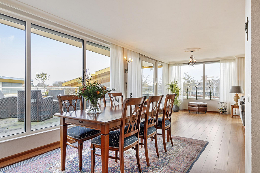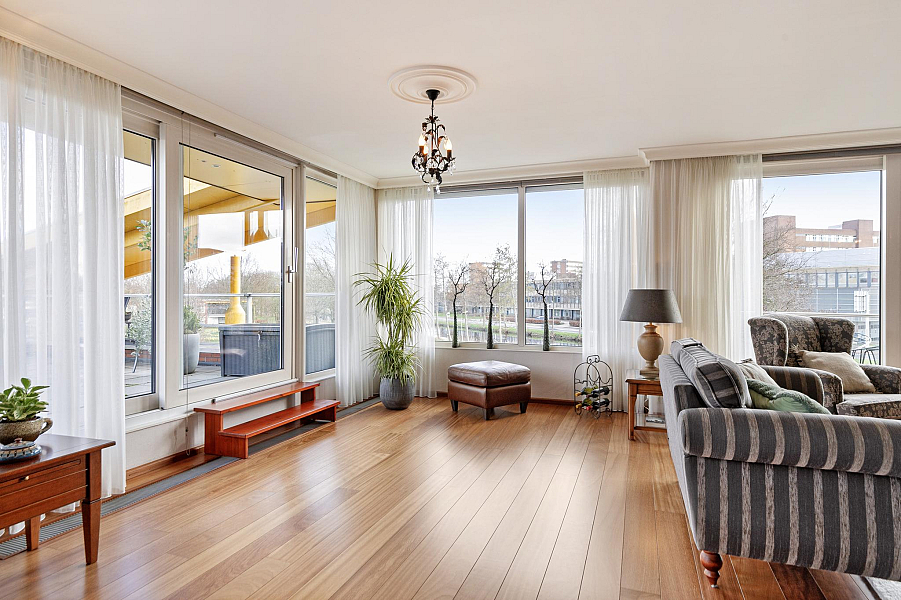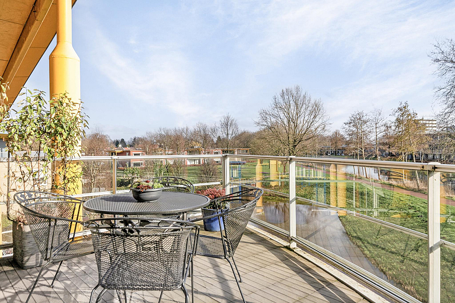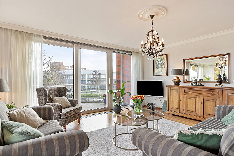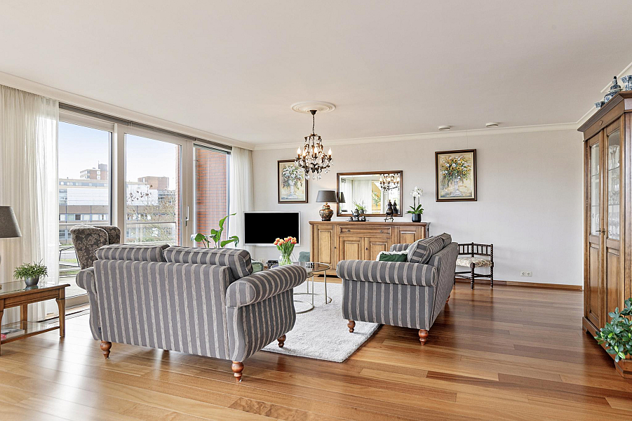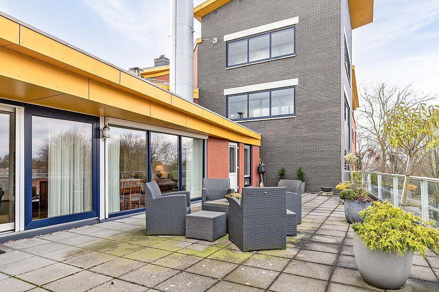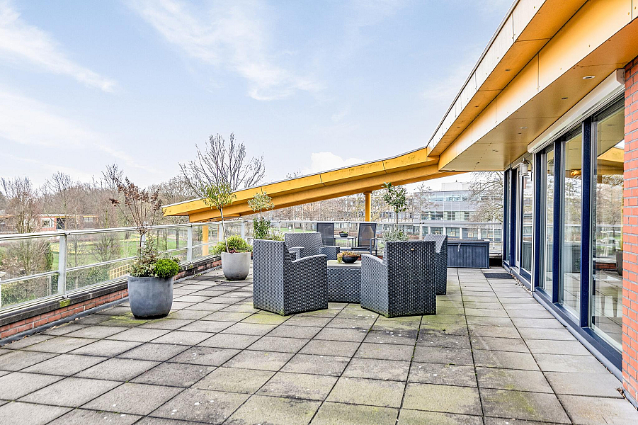 APPARTEMENT: Entree naar royale hal/gang, toiletruimte met hangend toilet en fontein, speelse living van ca. 47 m2 met veel lichtinval met toegang naar het balkon aan de voorzijde, alsmede toegang naar het riante dakterras op het zuidwesten met een vrij uitzicht over het naastgelegen park. De open woonkeuken van ca. 18m2 is voorzien van inbouwapparatuur (o.a. 4-pits gaskookplaat, afzuigkap, combi-oven, vaatwasser en koelkast). Vanuit de hal is de separate provisieruimte bereikbaar, alsmede de praktische bijkeuken/berging met opstelplaats voor wasmachine, wtw en cv-ketel (Remeha, bouwjaar 2013).
