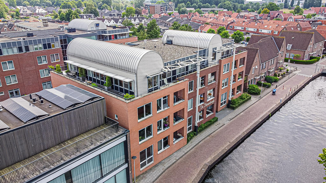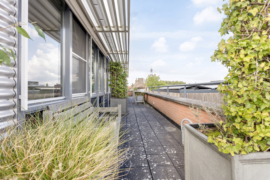 Het hoekpenthouse van 192 m2 op de vierde woonlaag is omgeven door een groot balkon en terras.
