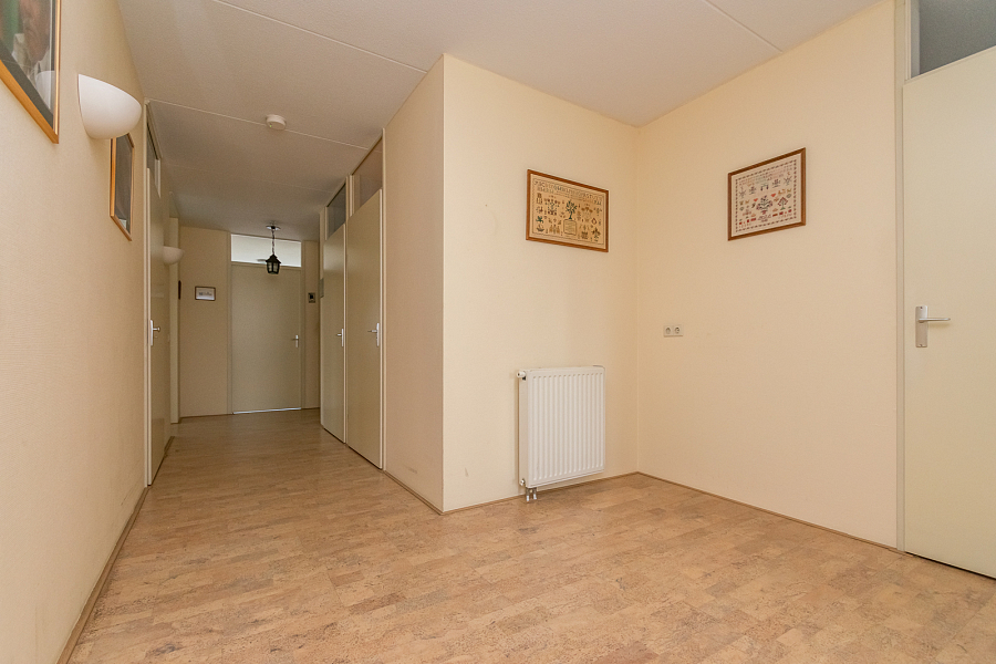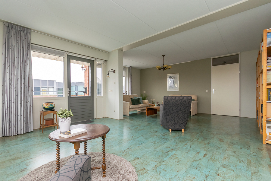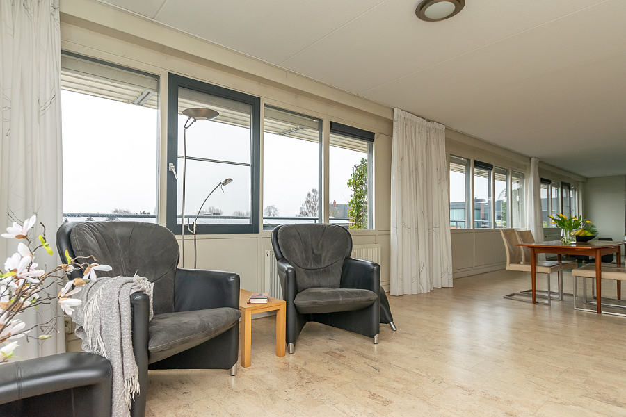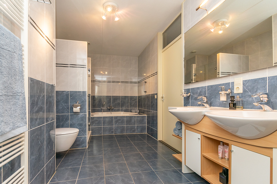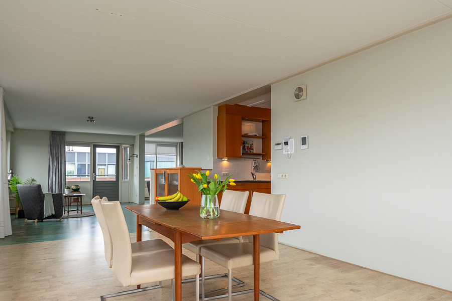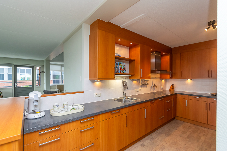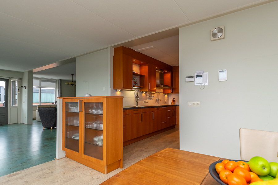 Entree, royale hal, werkkamer, 3 slaapkamers aan de voorzijde, bijkeuken/cv-ruimte (HR-ketel bouwjaar 2004), toilet met wandcloset, luxe royale badkamer met ligbad, douche, toilet en wastafelmeubel met dubbele wastafel. Tevens is de badkamer voorzien van vloerverwarming. De woon- en eetkamer (ca. 90 m²) met ruim balkon/terras aan de voor- en achterzijde wordt gescheiden door een open woonkeuken met veel kastruimte en uiteraard v.v. inbouwapparatuur.