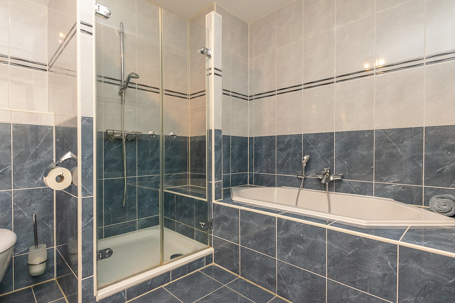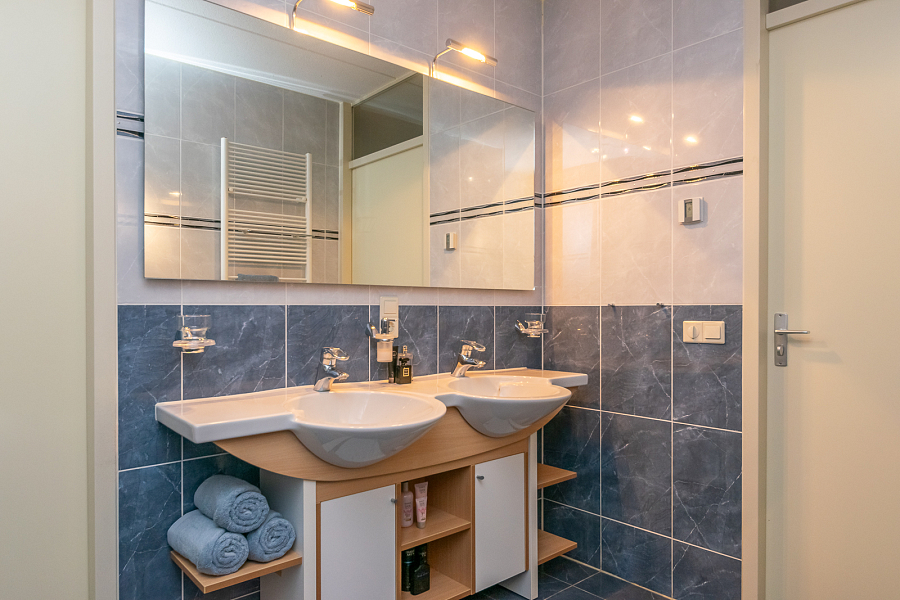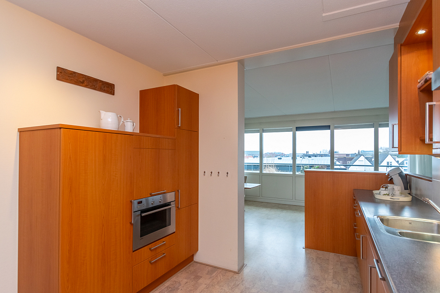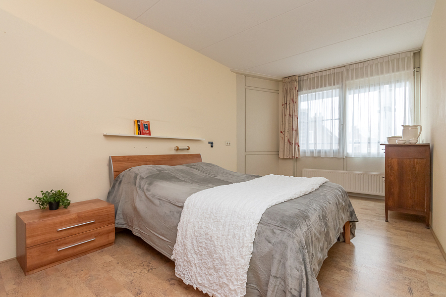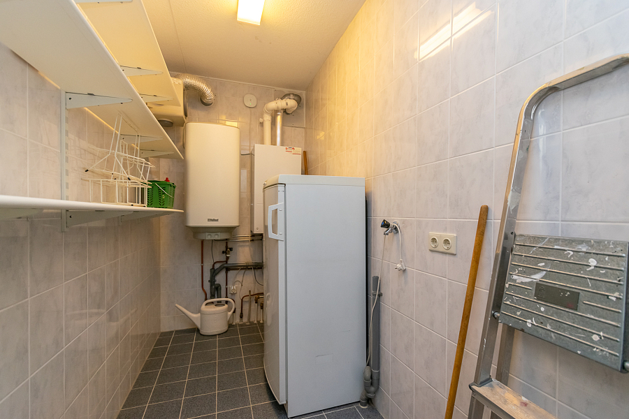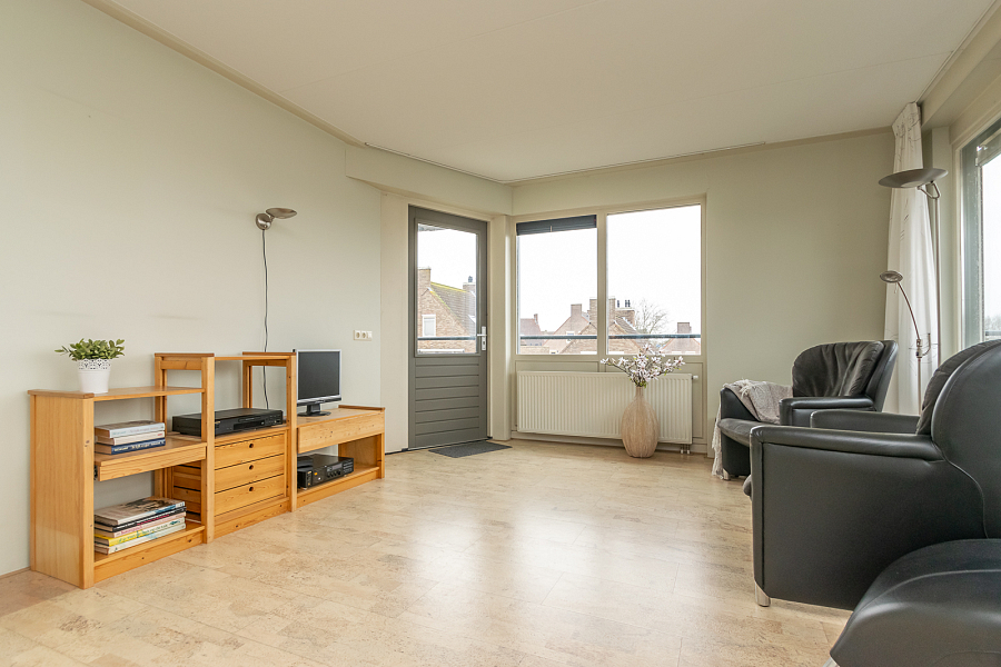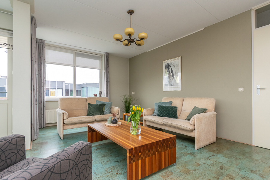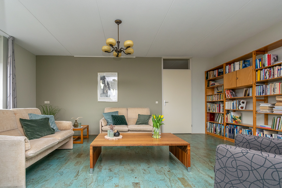 Entree, royale hal, werkkamer, 3 slaapkamers aan de voorzijde, bijkeuken/cv-ruimte (HR-ketel bouwjaar 2004), toilet met wandcloset, luxe royale badkamer met ligbad, douche, toilet en wastafelmeubel met dubbele wastafel. Tevens is de badkamer voorzien van vloerverwarming. De woon- en eetkamer (ca. 90 m²) met ruim balkon/terras aan de voor- en achterzijde wordt gescheiden door een open woonkeuken met veel kastruimte en uiteraard v.v. inbouwapparatuur.