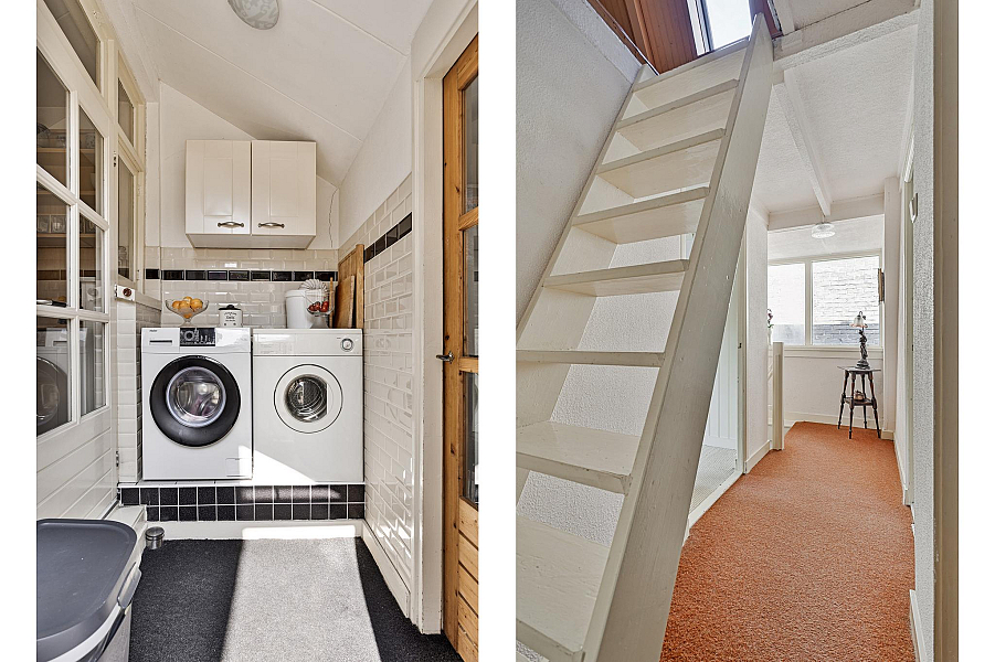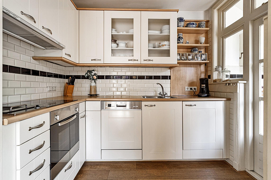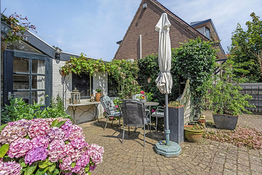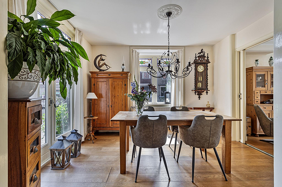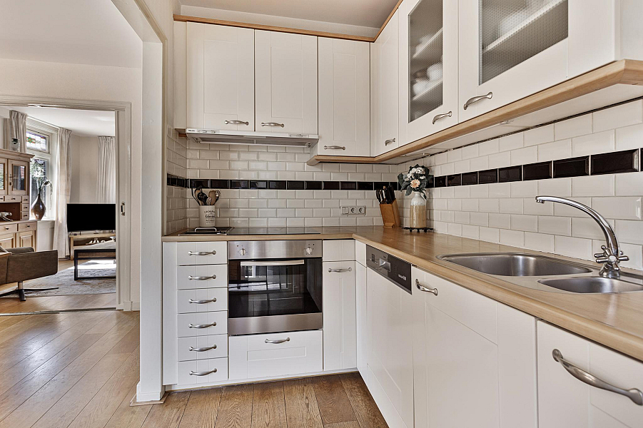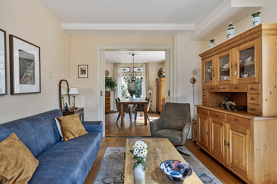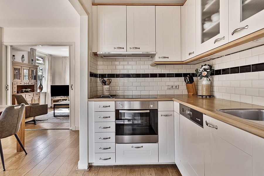 BEGANE GROND: Entree/hal met trapopgang naar de eerste verdieping (originele tegels zijn nog aanwezig achter de lambrizering), kelderkast, toiletruimte, zonnige woonkamer met veel lichtinval door de vele raampartijen en erker, open keuken met inbouwapparatuur (o.a. keramische kookplaat (2024), ingebouwde frituur, afzuigkap, oven (2022), koelkast en vaatwasser (2023), aangebouwde bijkeuken/achterportaal met wasmachine-aansluiting en doorloop naar de aangebouwde stenen berging.