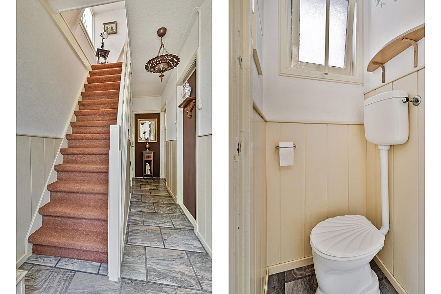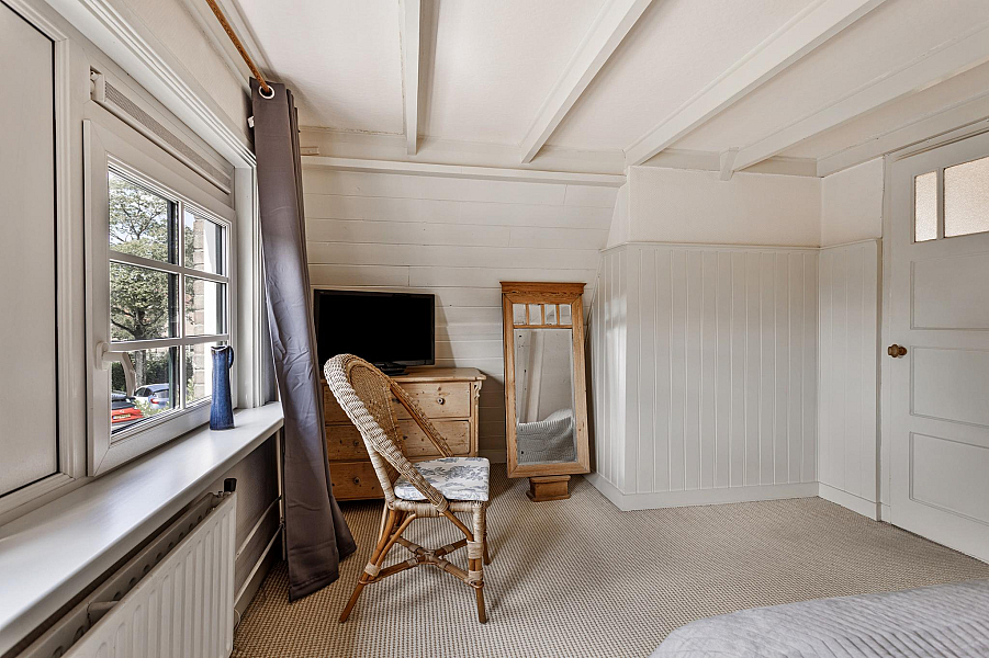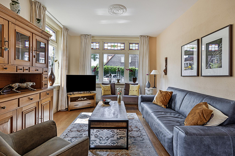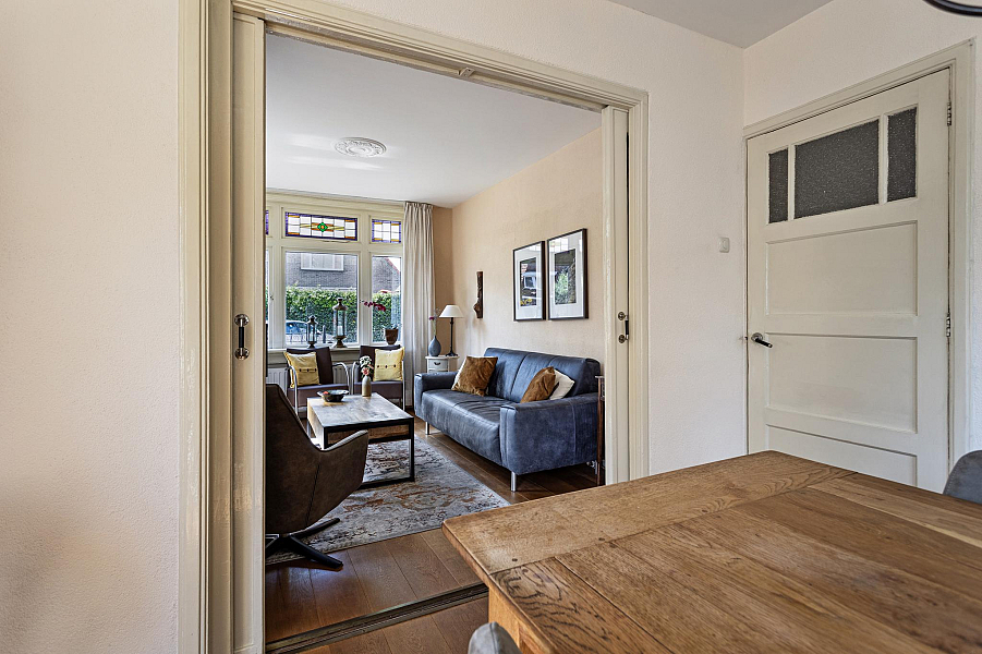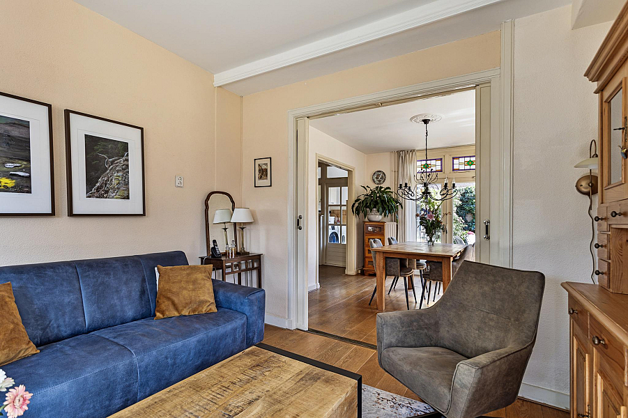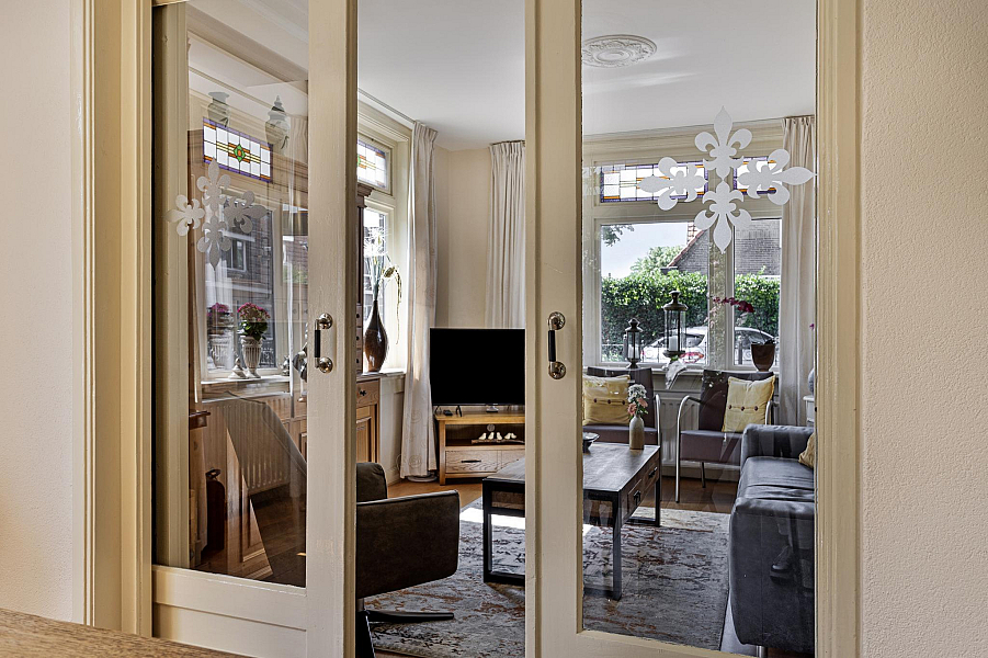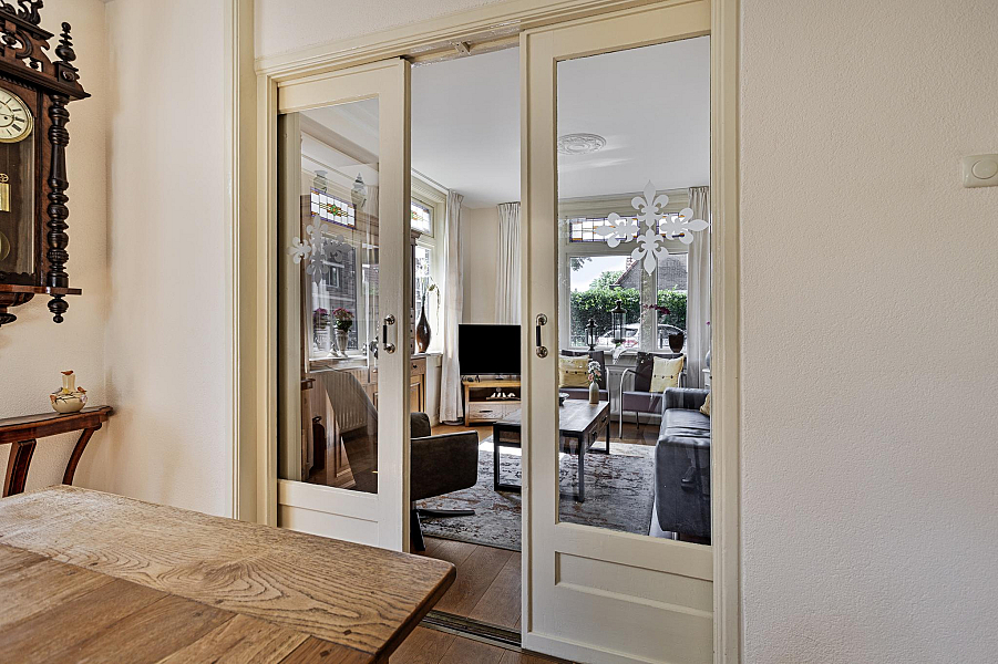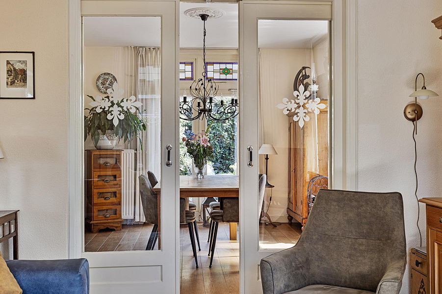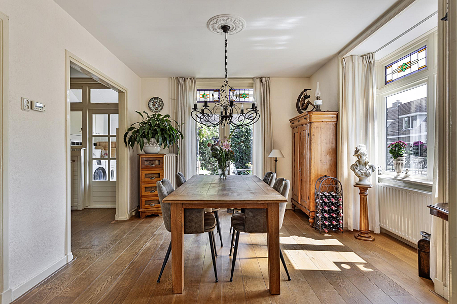 De woning is gebouwd in 1935 en beschikt nog over fraaie details als glas-in-lood-ramen, paneeldeuren, balkenplafond en erker.