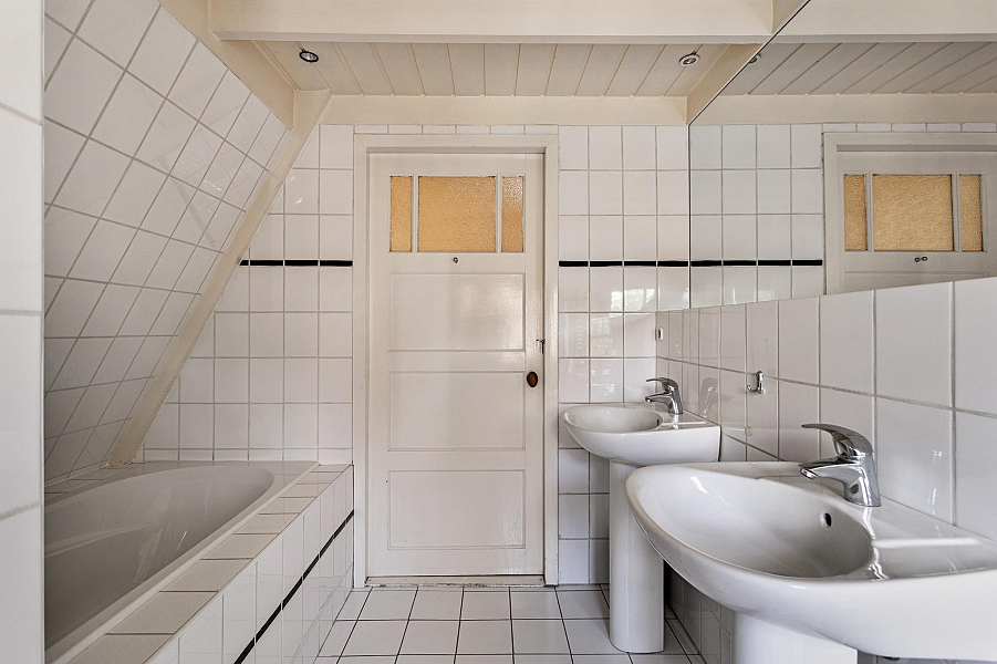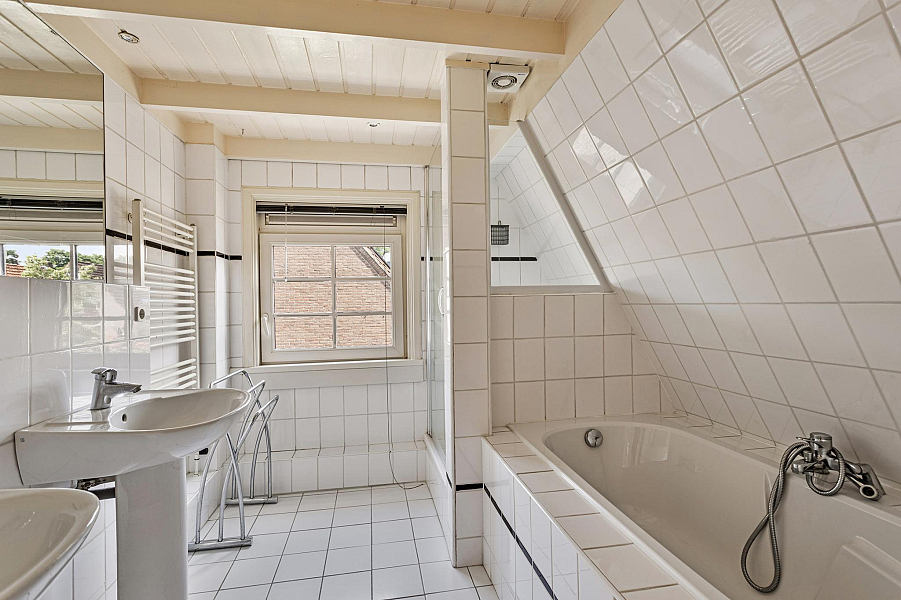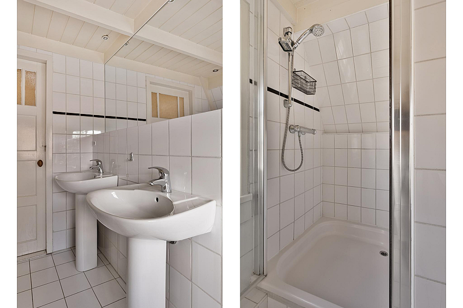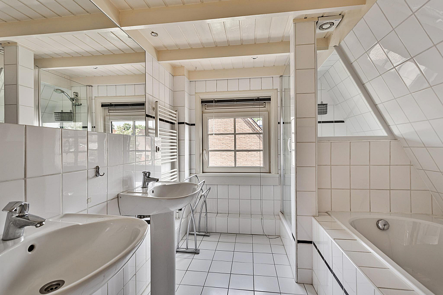 1E VERDIEPING: Overloop met dakkapel en vaste kastenwand, 2 goede slaapkamers van 13m2 en 8m2, royale badkamer met ligbad, douchecabine en 2 vaste wastafels, vaste trap naar ...