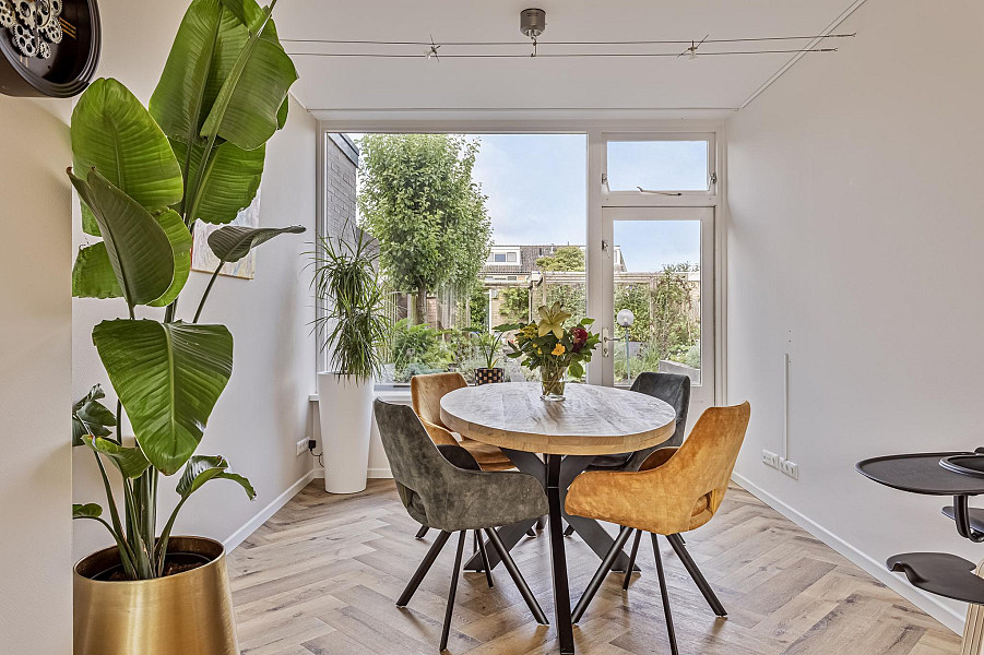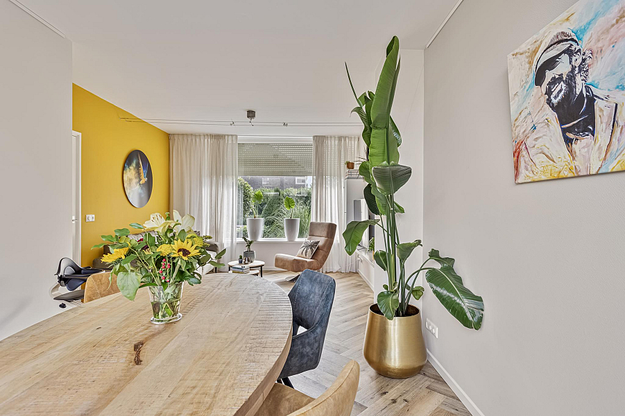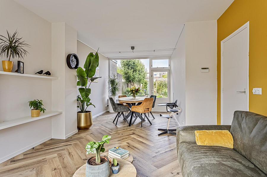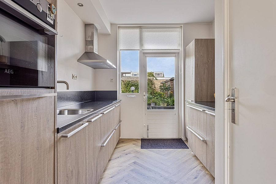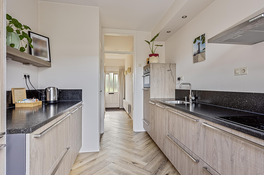 Begane grond: entree, toilet met wandcloset, gezellige doorzon woonkamer met mooie visgraat-PVC vloer met vloerverwarming en tuindeur, moderne inbouwkeuken (2018) met natuurstenen werkblad, 4-pits inductiekookplaat, afzuigkap, vaatwasser, combimagnetron, close-in boiler, koelkast en een vriezer.