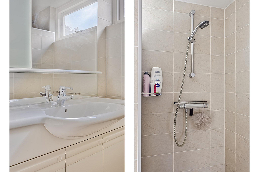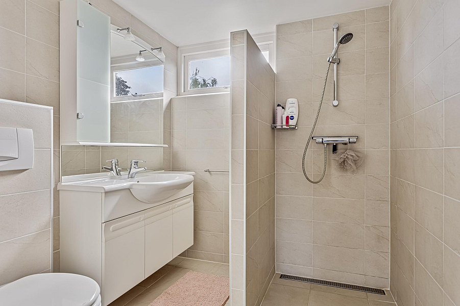 Eerste verdieping: overloop, 3 slaapkamers en de comfortabele badkamer (2004) met inloopdouche, wastafelmeubel en wandcloset.