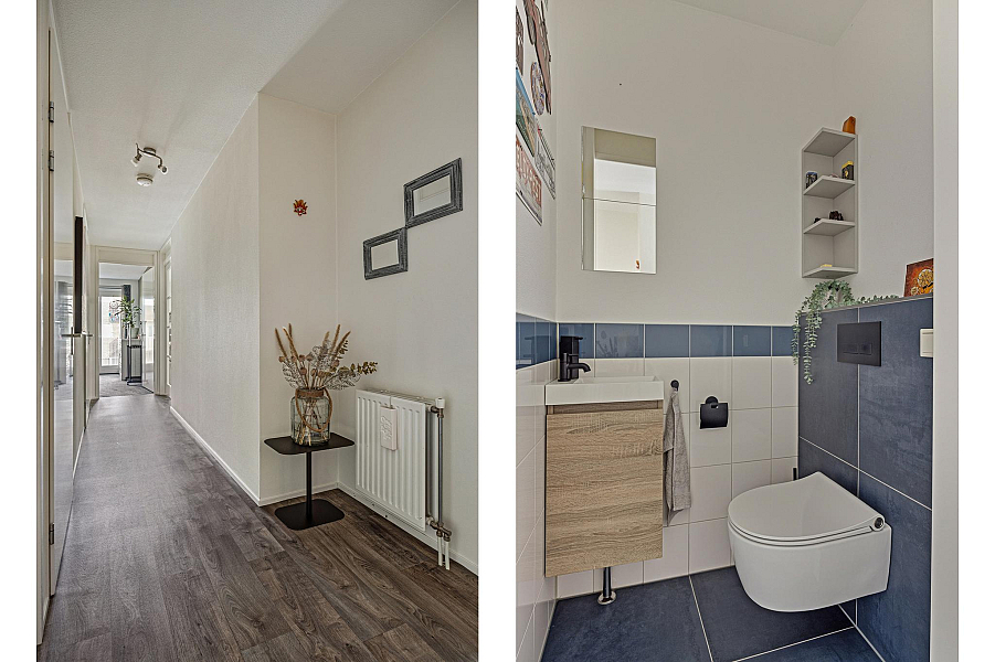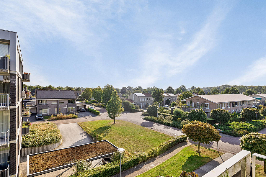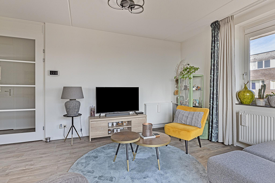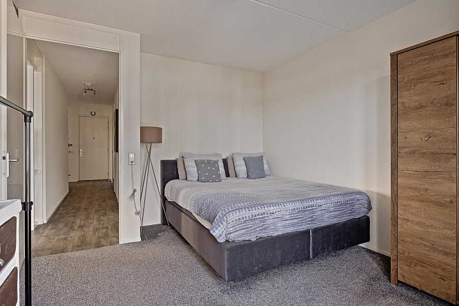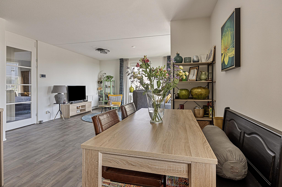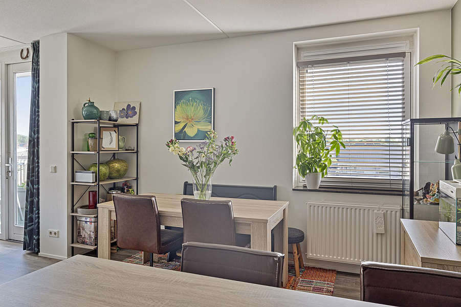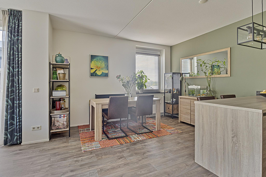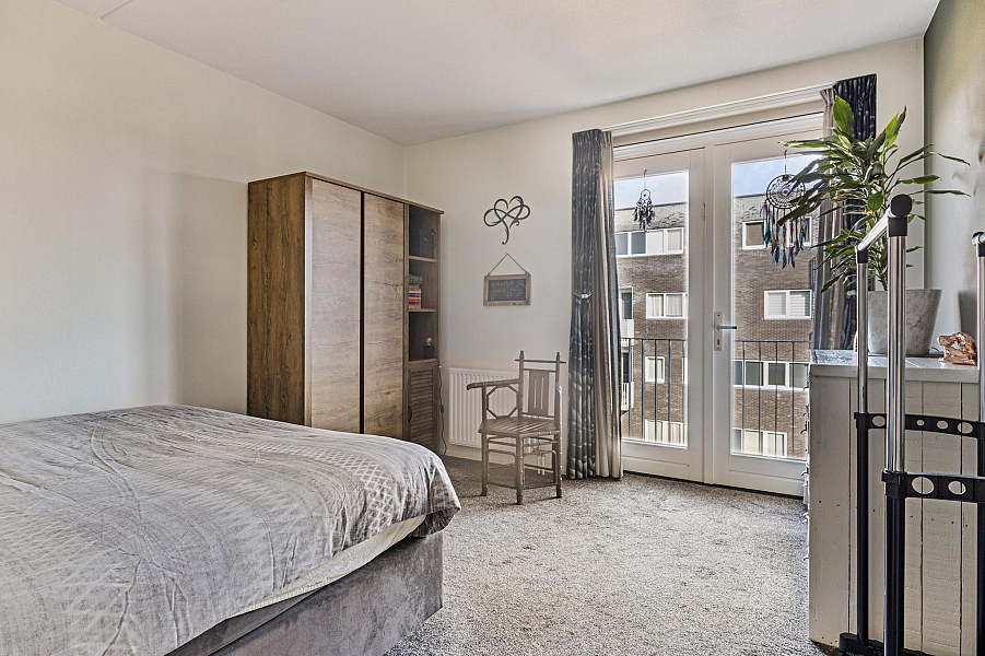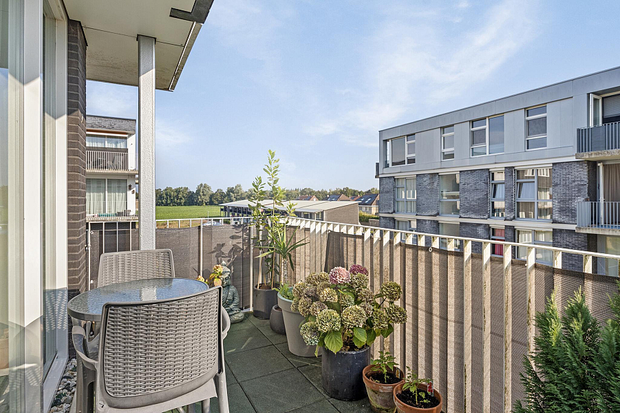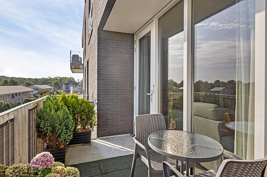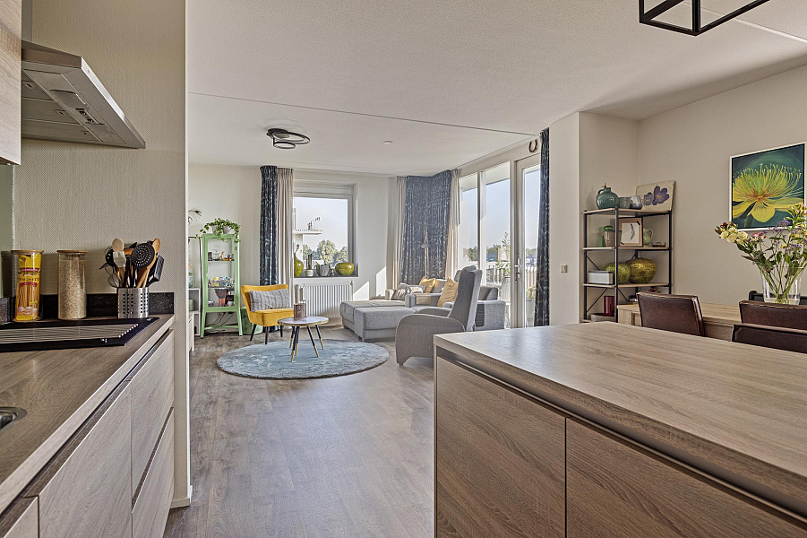 Entree/gang, toilet (2022) 2 ruime slaapkamers, moderne badkamer (gemoderniseerd 2021) met inloopdouche en wastafelmeubel, gezellige woonkamer met fraaie lichtinval en een groot balkon, moderne keuken (2019) met inductiekookplaat, afzuigkap, koelkast en combimagnetron. In de praktische bijkeuken is een opstelplaats voor wasmachine en droger aanwezig.