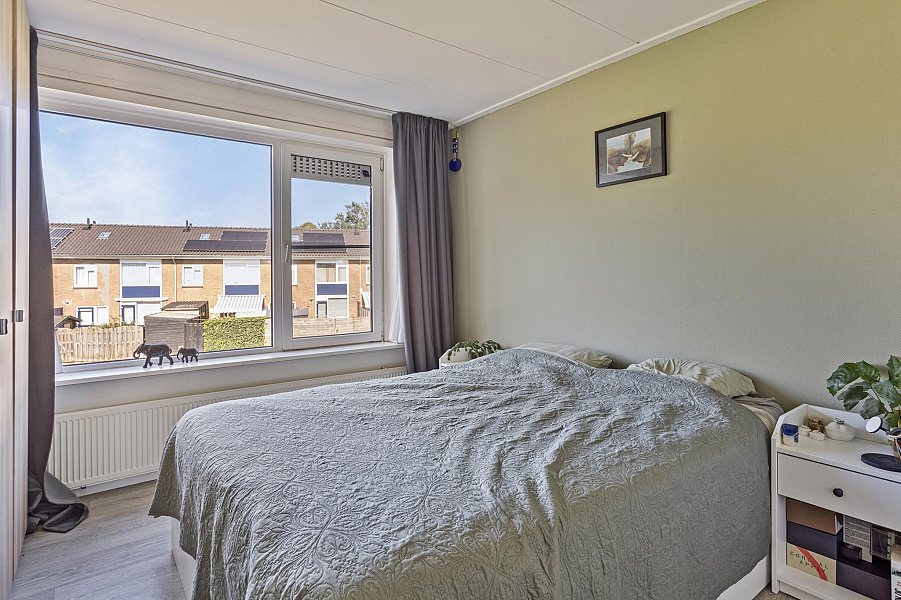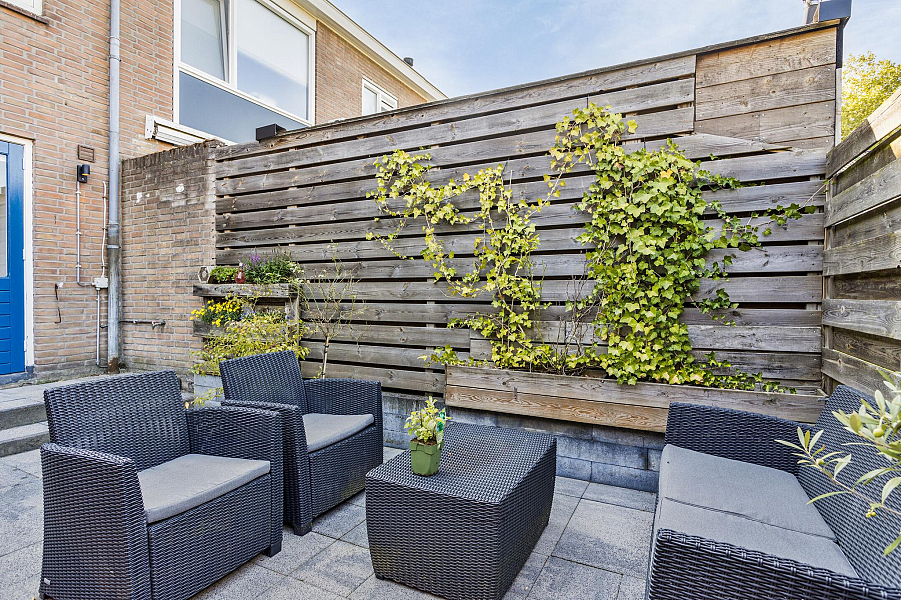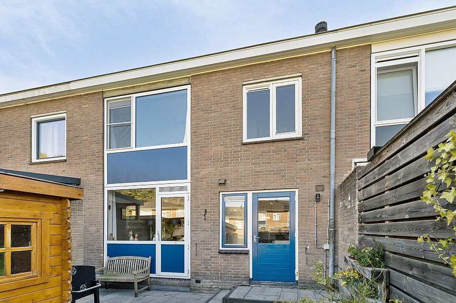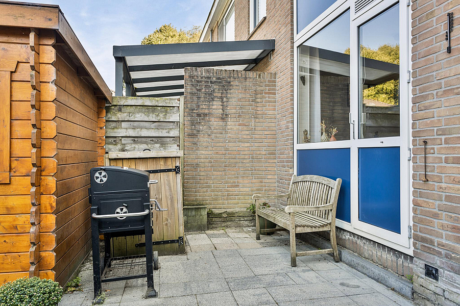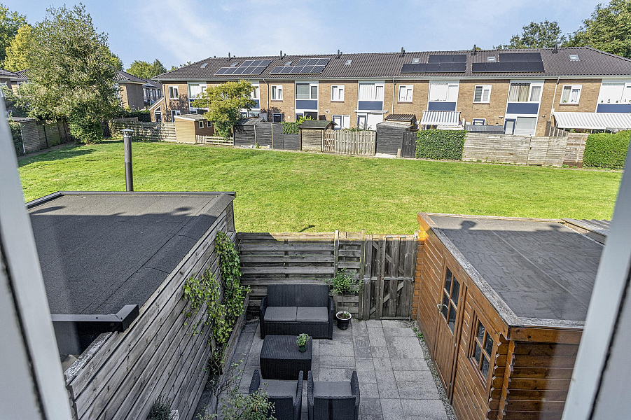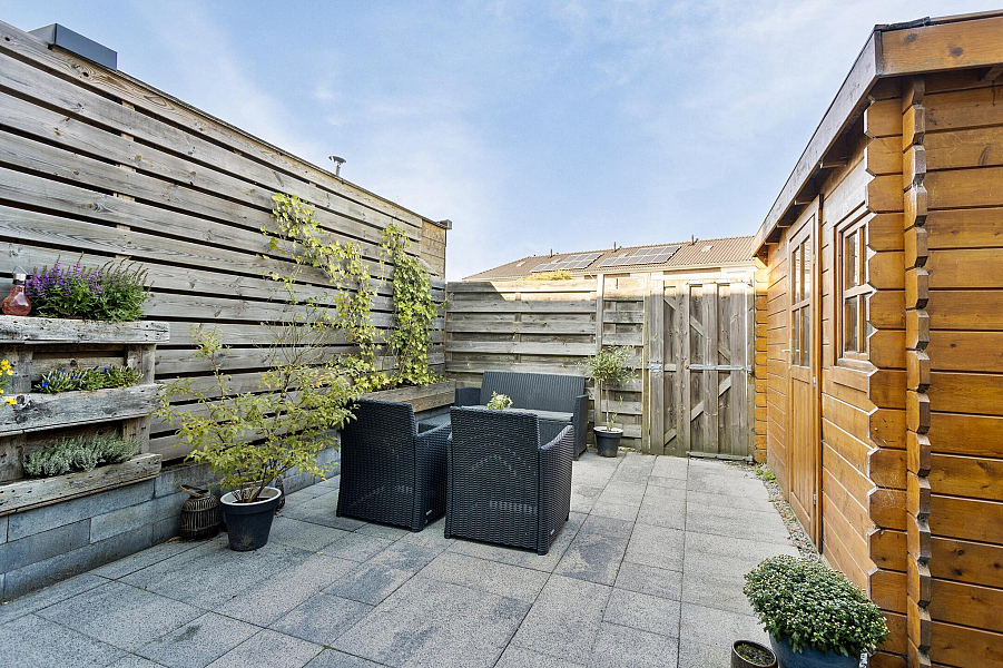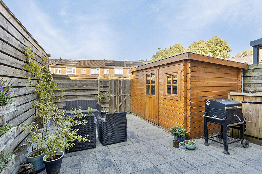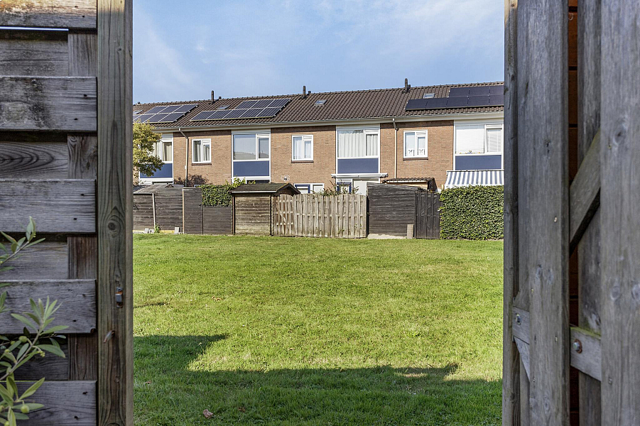 De onderhoudsvriendelijk aangelegde achtertuin is gelegen op het noordoosten is voorzien van een praktische houten tuinschuur welke is voorzien van elektra. De tuin is ook middels een achterom bereikbaar. Aan de achterzijde van de woning ligt een speelveld.