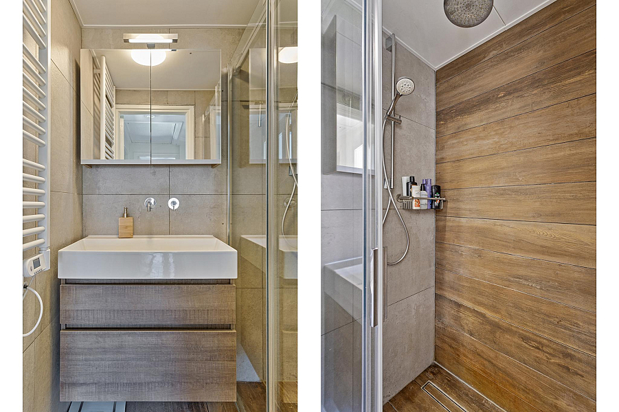 Eerste verdieping: overloop, badkamer met inloopdouche, vaste wastafel en elektrische designradiator. Drie slaapkamers welke zijn voorzien van vaste kasten. Op een van de slaapkamers is een opstelplaats gecreëerd voor wasmachine en droger.