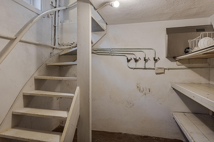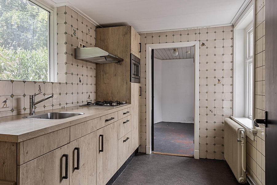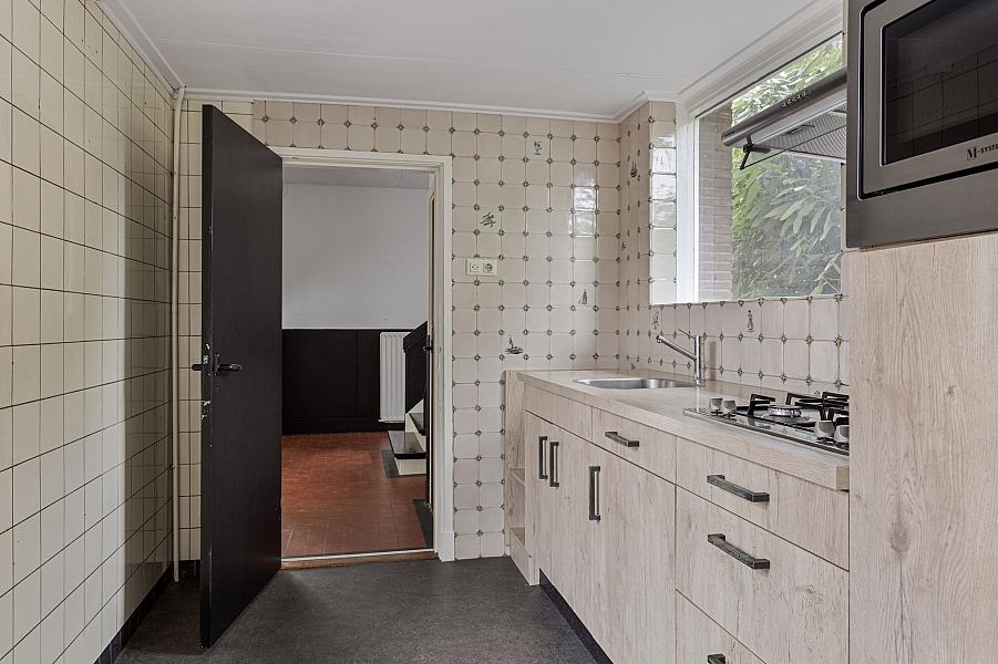 Begane grond: hal/entree met authentieke tegelvoer, toilet met fontein, provisiekelder, L-vormige woonkamer met schouw, laminaatvloer en grote raampartijen, dichte keuken voorzien van inbouwapparatuur (5 pits gas kookplaat, afzuigkap en een koelkast), bijkeuken met uitstortgootsteen en witgoedaansluiting.