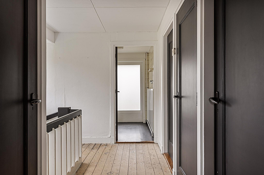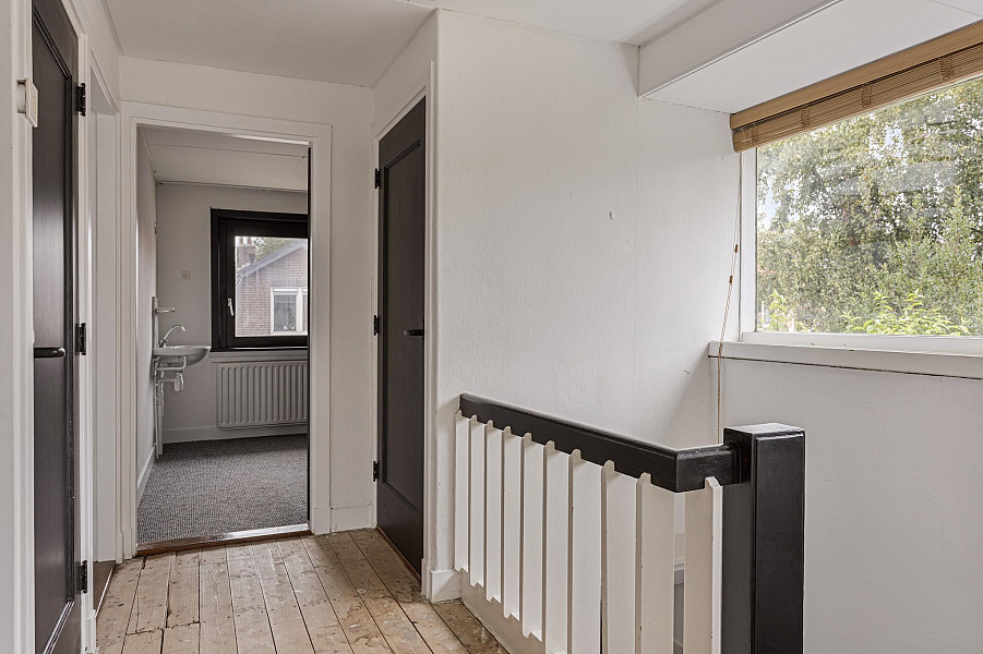 Eerste verdieping: overloop met kastruimte en groot raam, 3 slaapkamers waarvan 2 zeer royaal en beide voorzien van vaste kast en wastafel, originele badkamer voorzien van een douche.