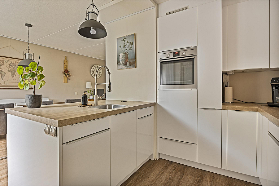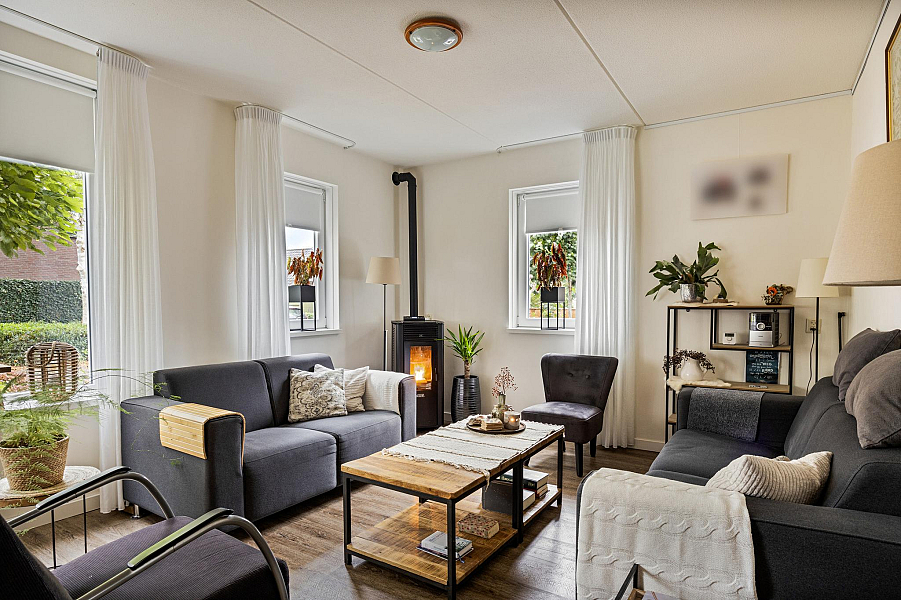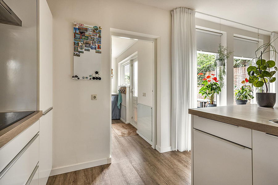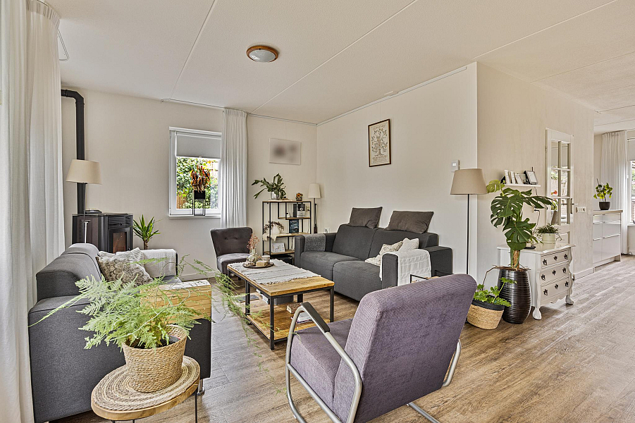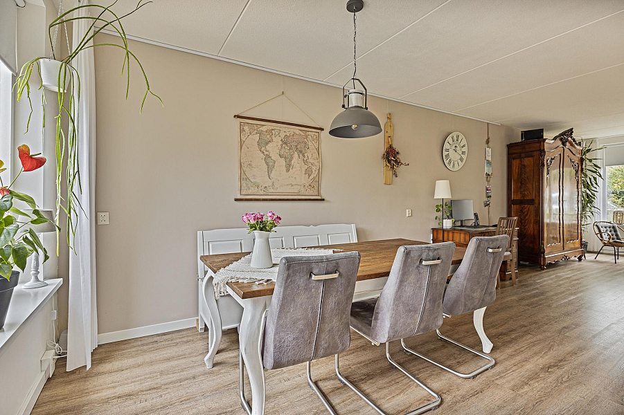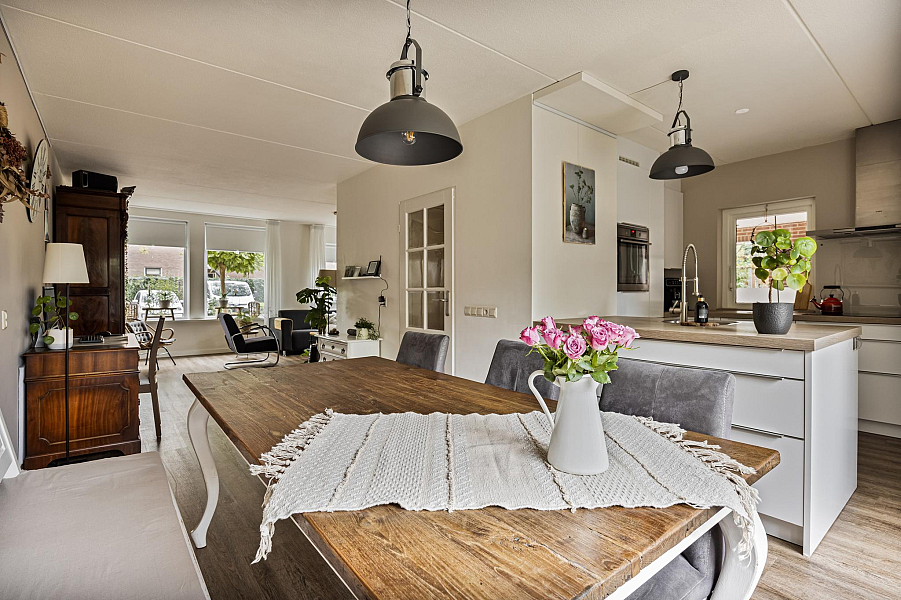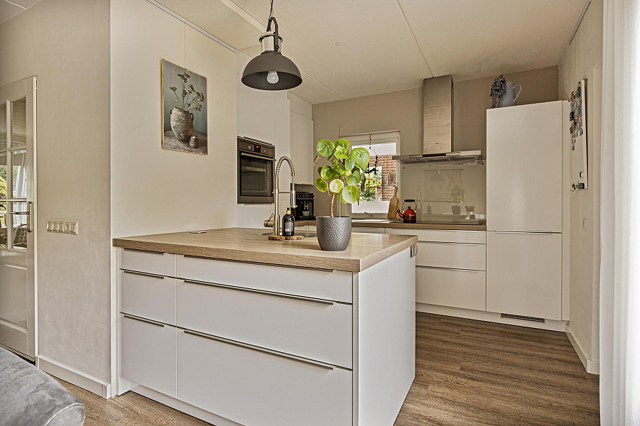 Hal met meterkast, modern toilet met wandcloset, sfeervolle zeer ruime L-vormige woonkamer met PVC vloer en pellet kachel, tuingerichte open moderne woonkeuken (2016) met diverse inbouwapparatuur (o.a. inductie kookplaat, oven, grote koelkast en vaatwasser), bijkeuken met witgoedaansluitingen en doorgang naar de extra lange en brede garage met extra berging. De begane grond vloer is voorzien van vloerverwarming.