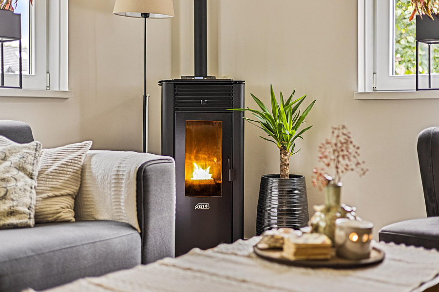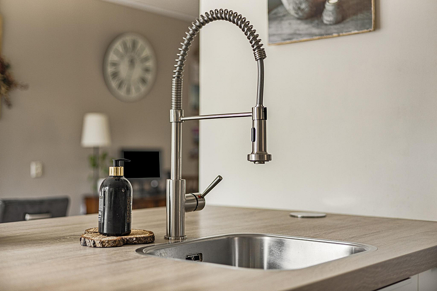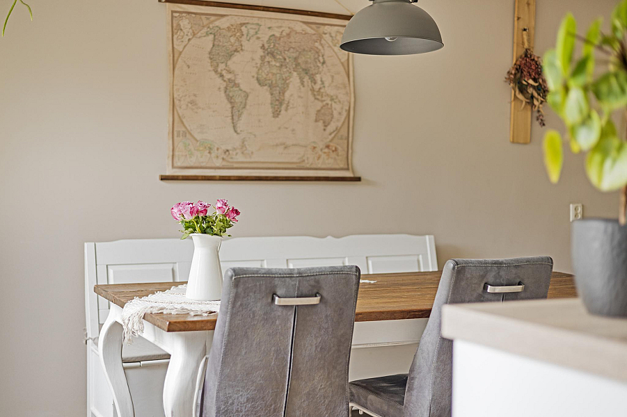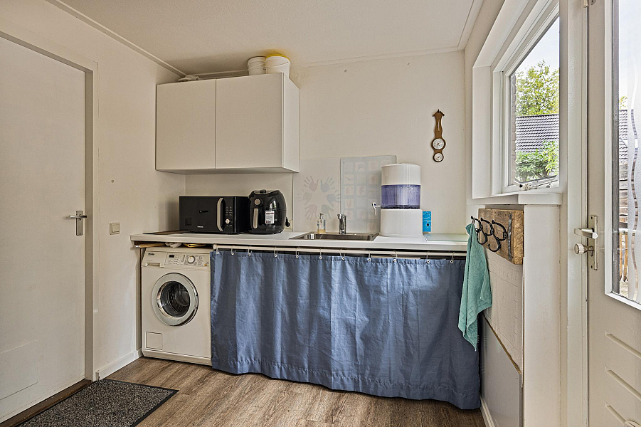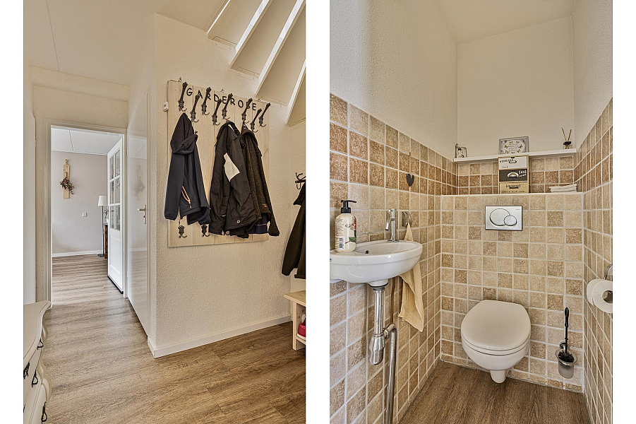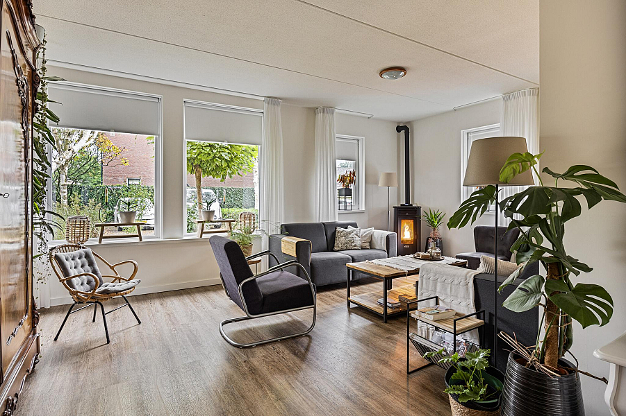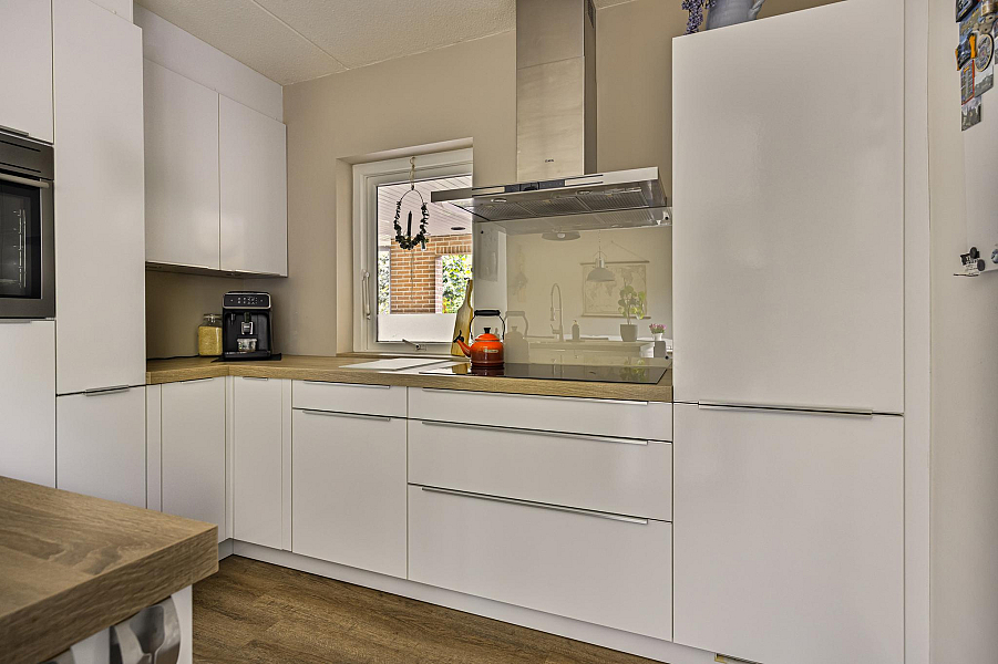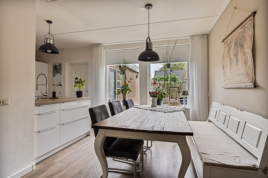 Hal met meterkast, modern toilet met wandcloset, sfeervolle zeer ruime L-vormige woonkamer met PVC vloer en pellet kachel, tuingerichte open moderne woonkeuken (2016) met diverse inbouwapparatuur (o.a. inductie kookplaat, oven, grote koelkast en vaatwasser), bijkeuken met witgoedaansluitingen en doorgang naar de extra lange en brede garage met extra berging. De begane grond vloer is voorzien van vloerverwarming.