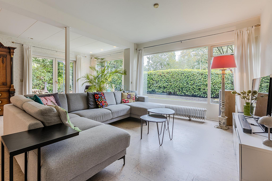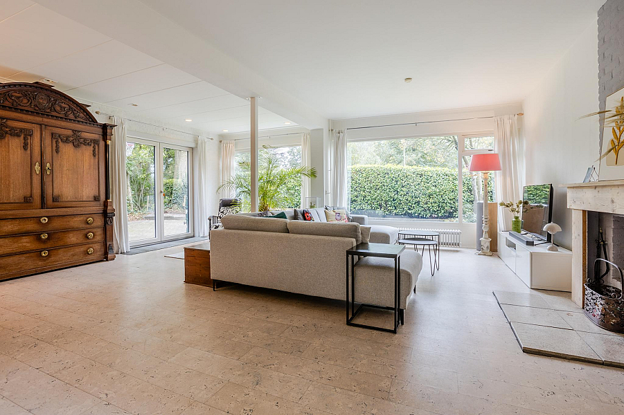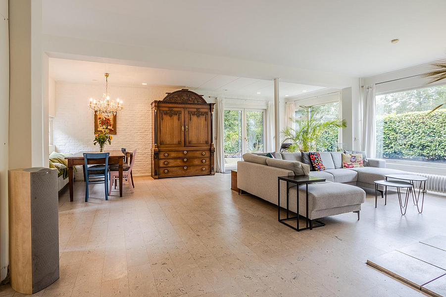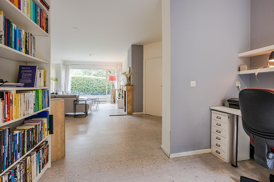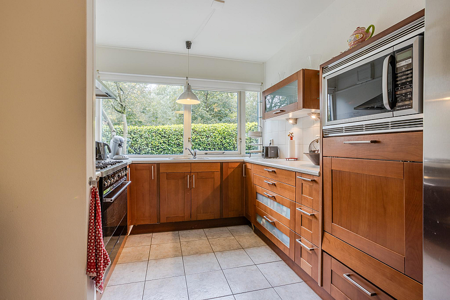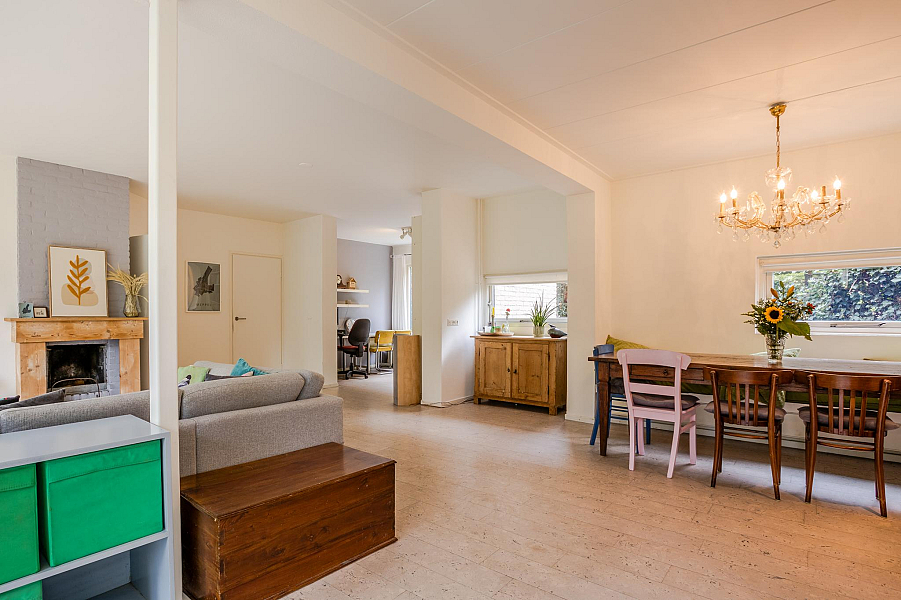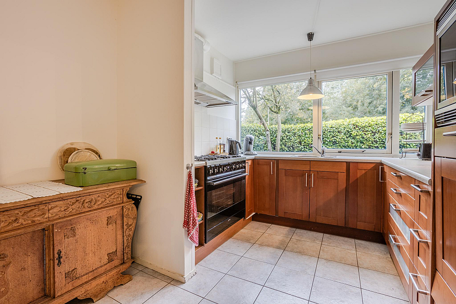 Entree met trapopgang en toiletruimte v.v. fontein. De speels ingedeelde woonkamer is heerlijk licht door de raampartijen rondom, er is een werkhoek, open haard en er zijn openslaande tuindeuren naar de heerlijke achtertuin. De keuken is v.v. een gaskookplaat met grote oven, magnetron en vaatwasser (op hoogte). In de bijkeuken de plek voor de wasmachine en droger, hier nog een deur richting de achtertuin. Via de bijkeuken kan men binnendoor naar de garage.
