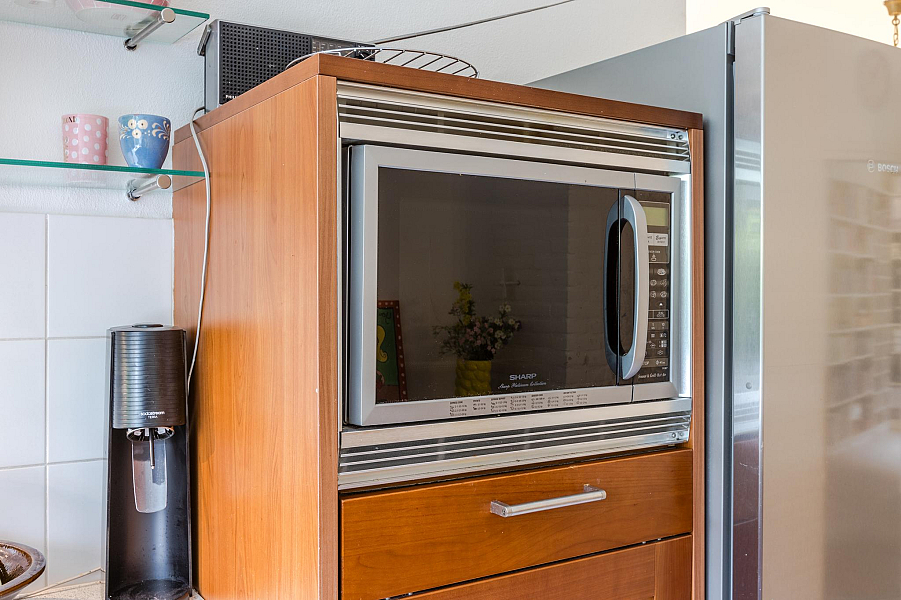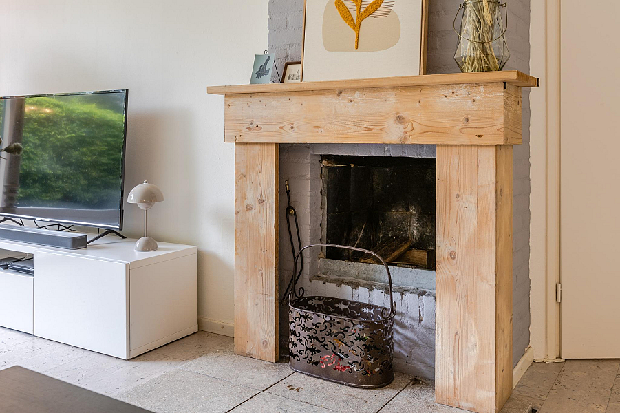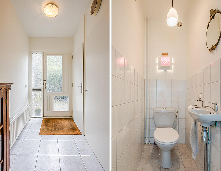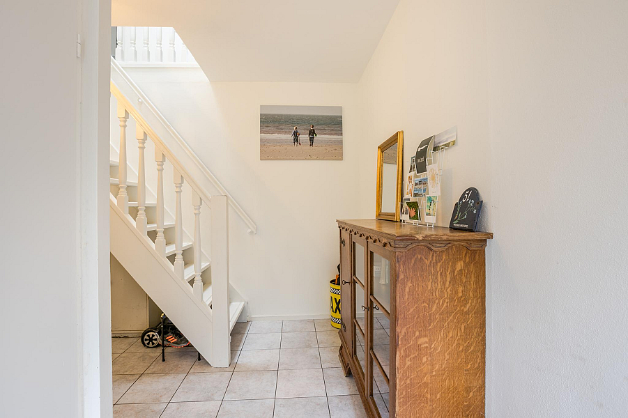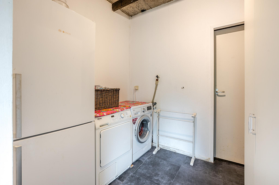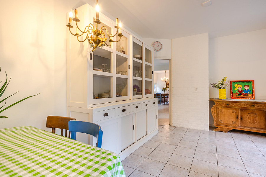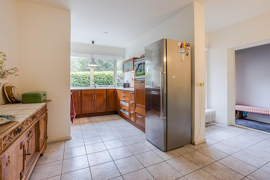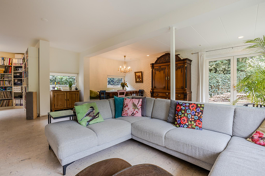 Entree met trapopgang en toiletruimte v.v. fontein. De speels ingedeelde woonkamer is heerlijk licht door de raampartijen rondom, er is een werkhoek, open haard en er zijn openslaande tuindeuren naar de heerlijke achtertuin. De keuken is v.v. een gaskookplaat met grote oven, magnetron en vaatwasser (op hoogte). In de bijkeuken de plek voor de wasmachine en droger, hier nog een deur richting de achtertuin. Via de bijkeuken kan men binnendoor naar de garage.
