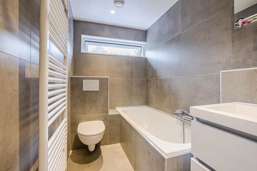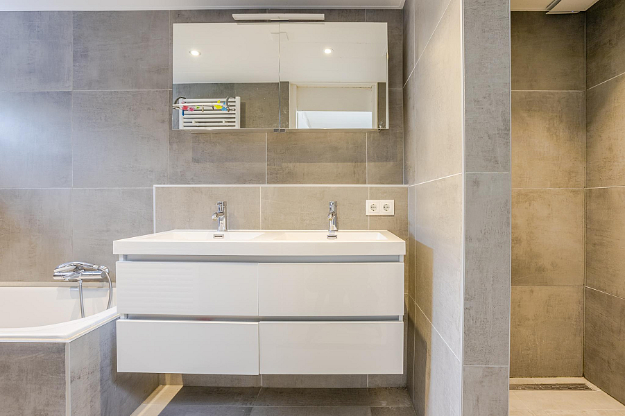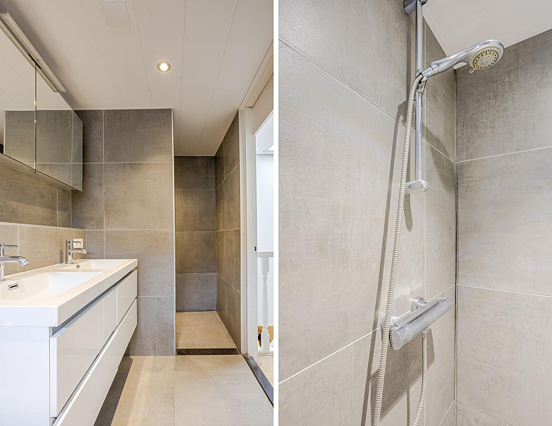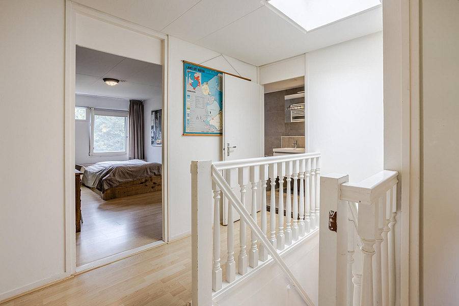 Overloop, maar liefst 5 slaapkamers en een moderne badkamer v.v. ligbad, inloopdouche, dubbel wastafelmeubel en 2e toilet.