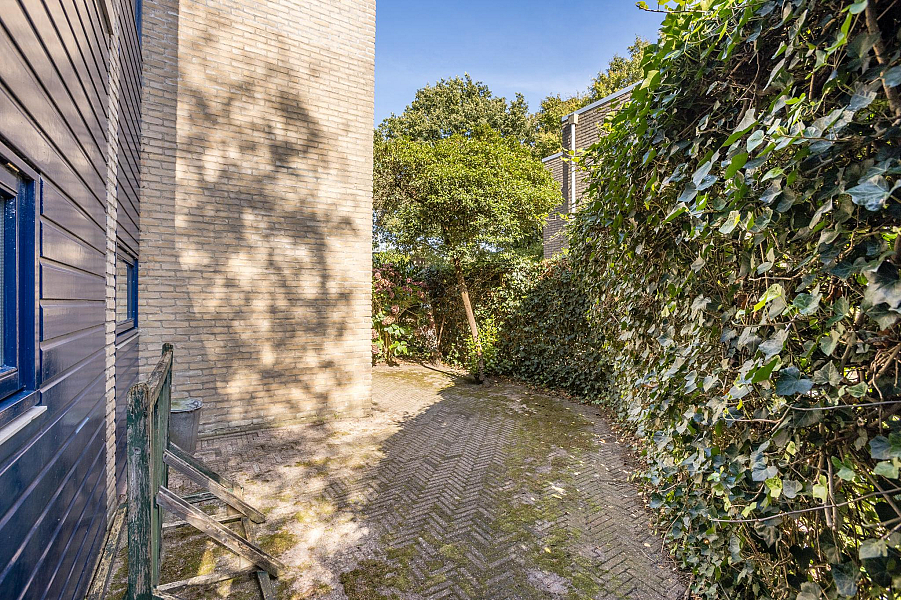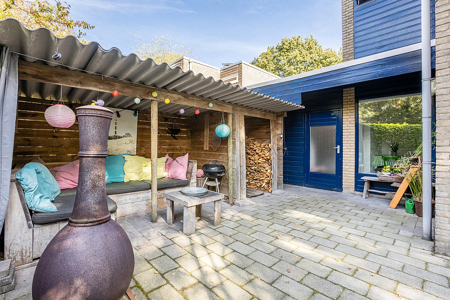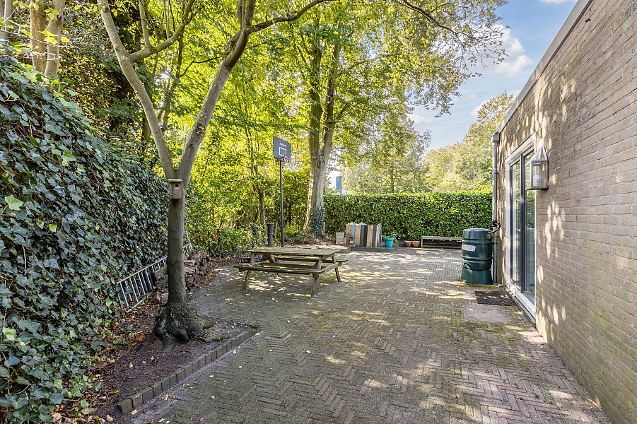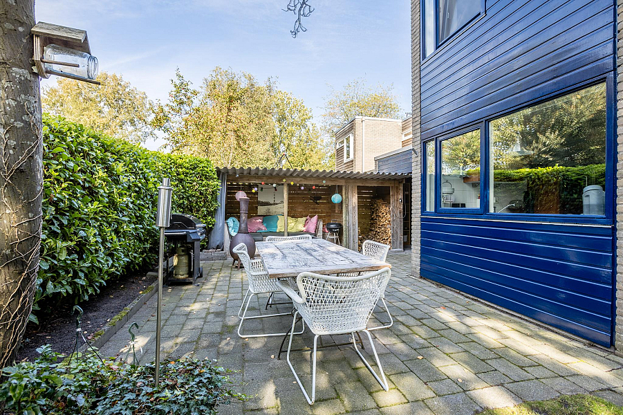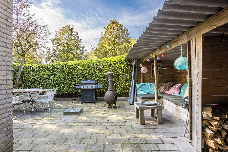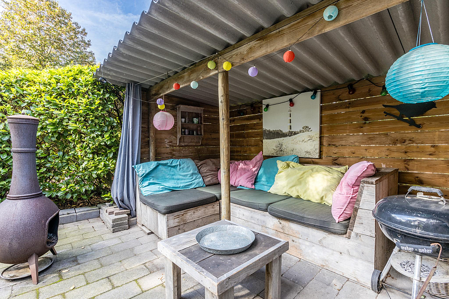 In de achtertuin een sfeervolle overkapping, verder zijn er meerdere plekken waar men een leuke zithoek kan creëren. De tuin is omsloten door een groene haag waardoor er veel privacy is.