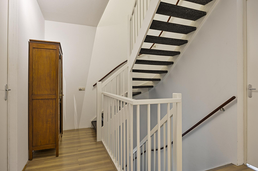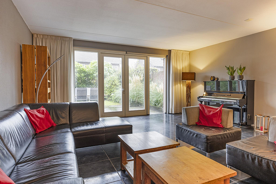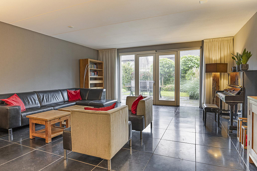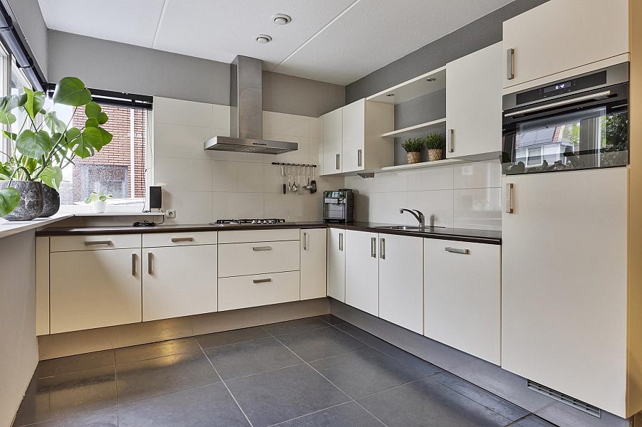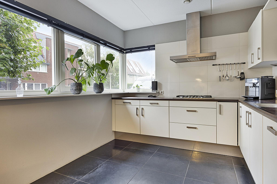 Entree/hal met trapkast, toiletruimte met hangend toilet en fontein, zeer riante tuingerichte woonkamer met dubbele openslaande deur naar de zonnige tuin. De aan de voorzijde gelegen keuken is voorzien van een koelkast, vaatwasser, combioven en gaskookplaat. De gehele begane grond is voorzien van een fraaie donkere plavuisvloer met vloerverwarming.