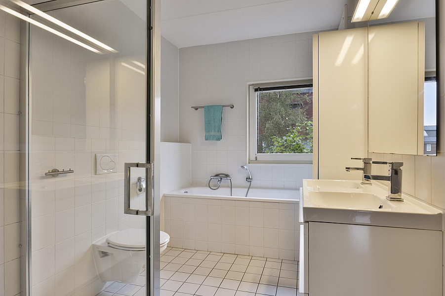 Royale overloop, 3 slaapkamers en een ruime badkamer welke is voorzien van vloerverwarming, douche, ligbad, 2e toilet, dubbele wastafel en designradiator. Voor de wasmachine, droger en cv-ketel is op deze etage een aparte ruimte ingericht. Hier bevinden zich tevens de Intergas CV ketel en ITHO mv box.