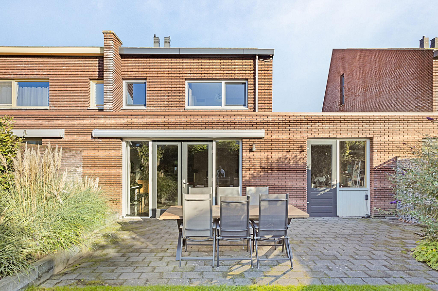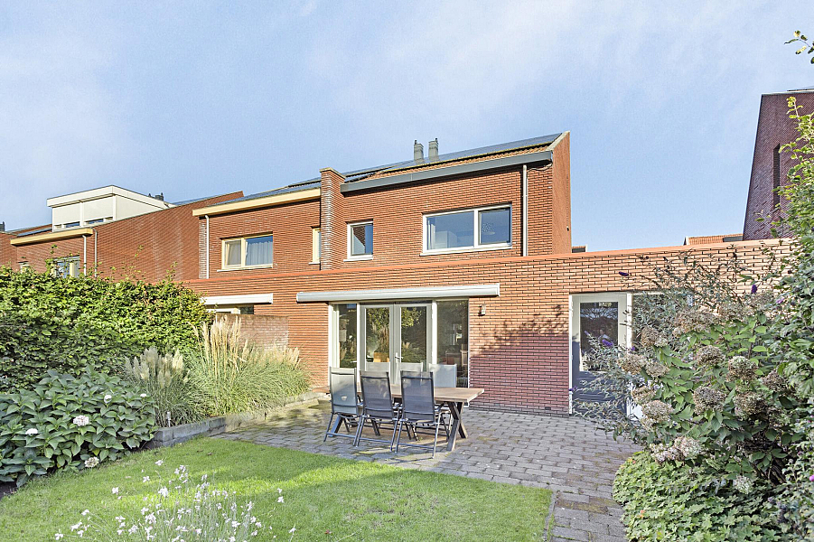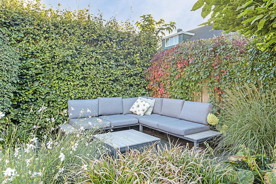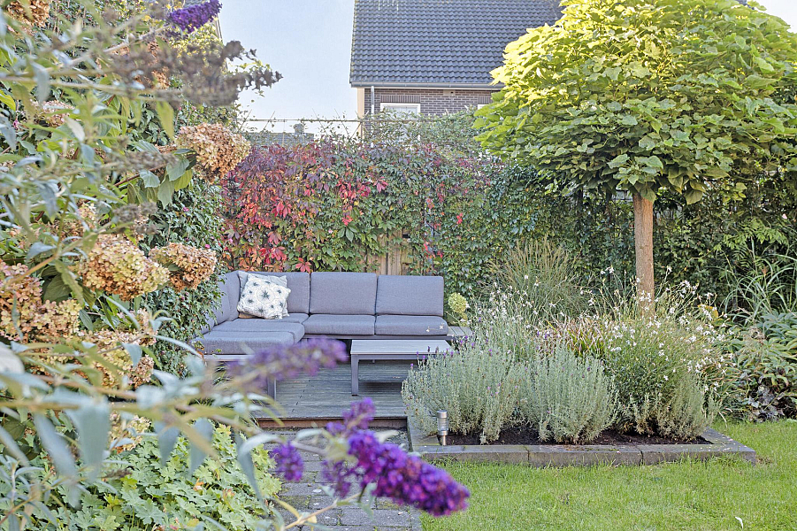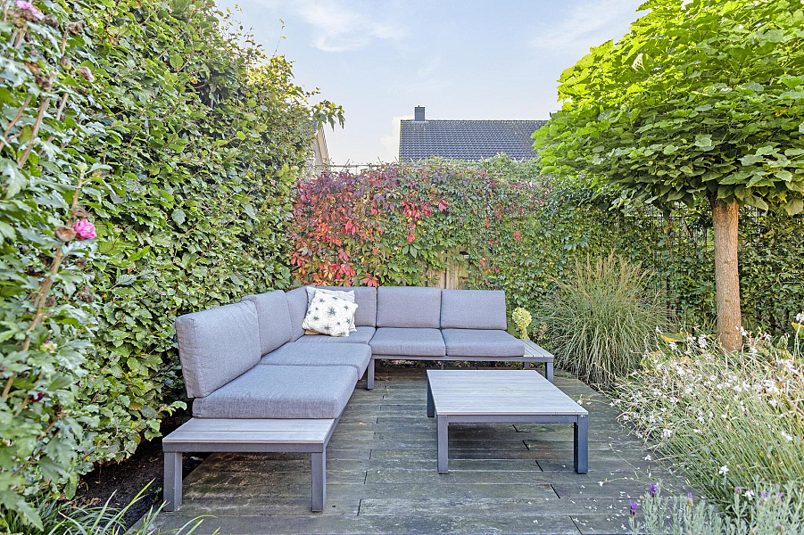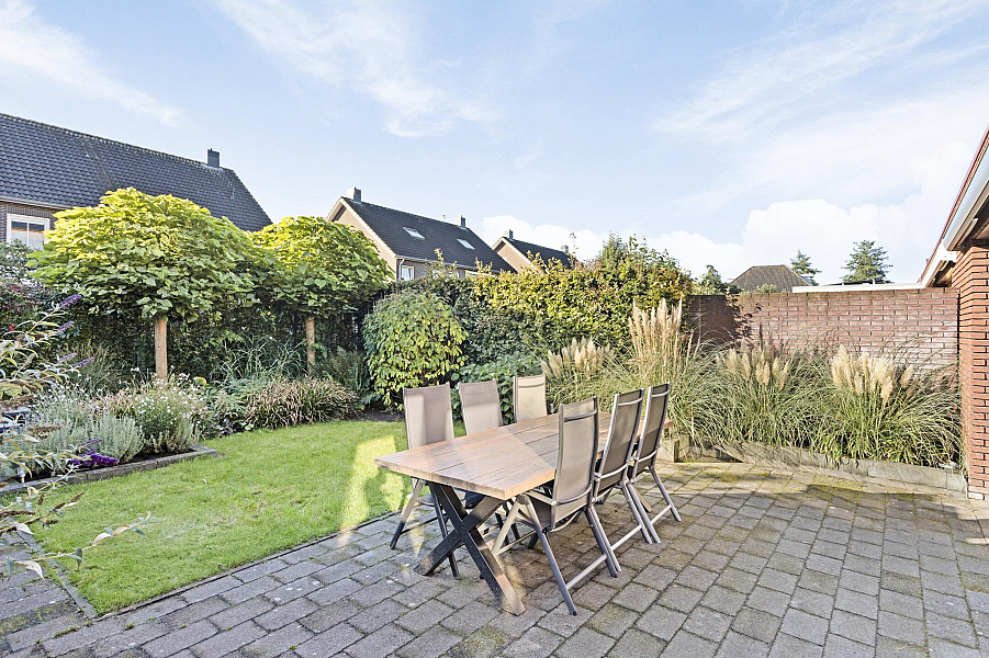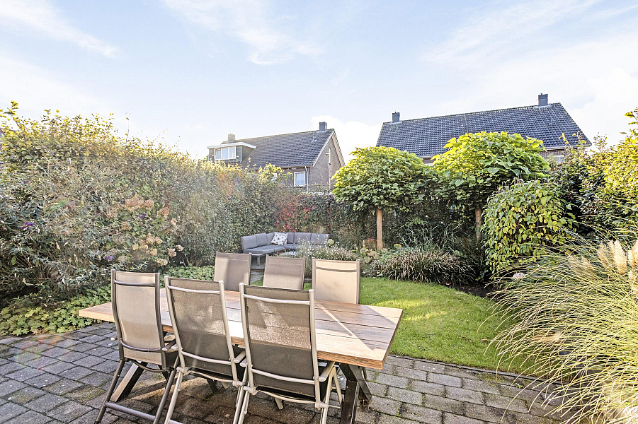 De op het zonnige zuidoosten gelegen tuin is goed van formaat en beschikt over een terras, gras, achterom en elektrisch zonnescherm.