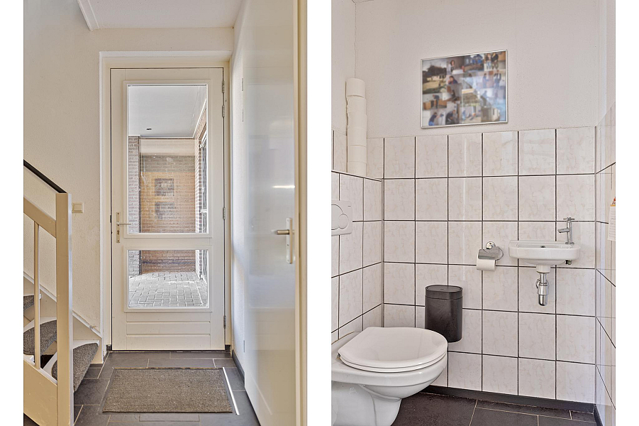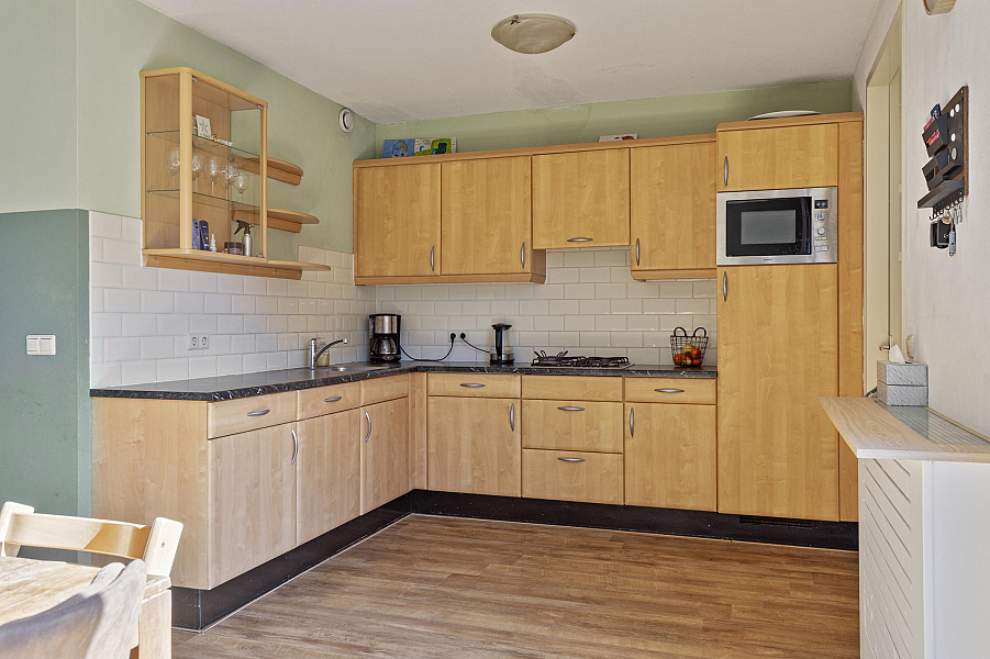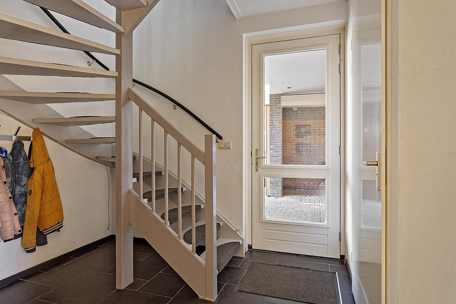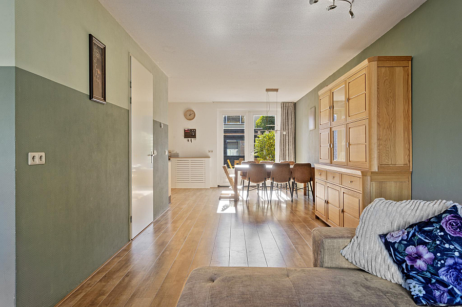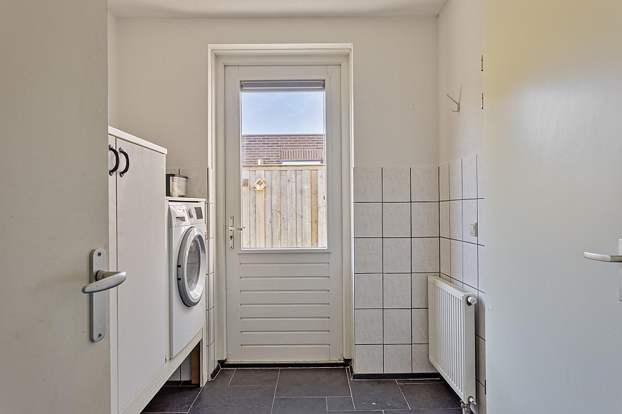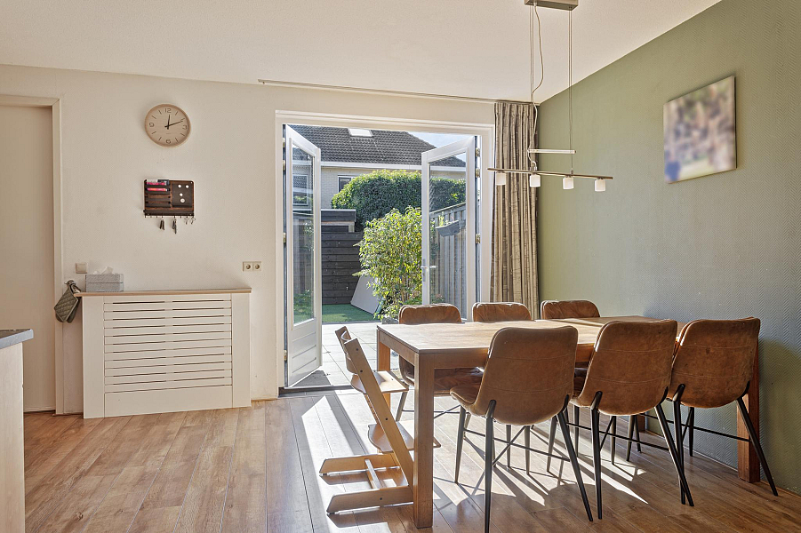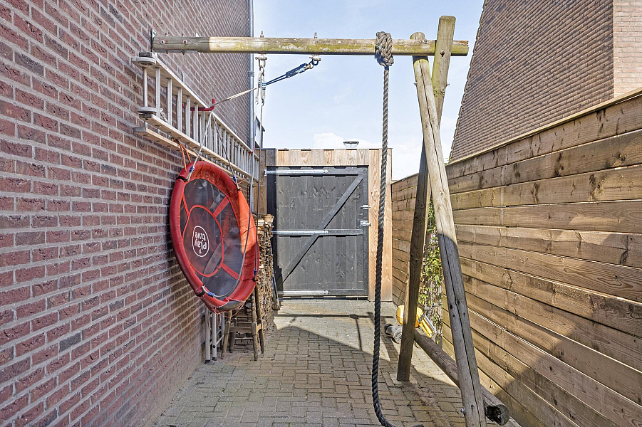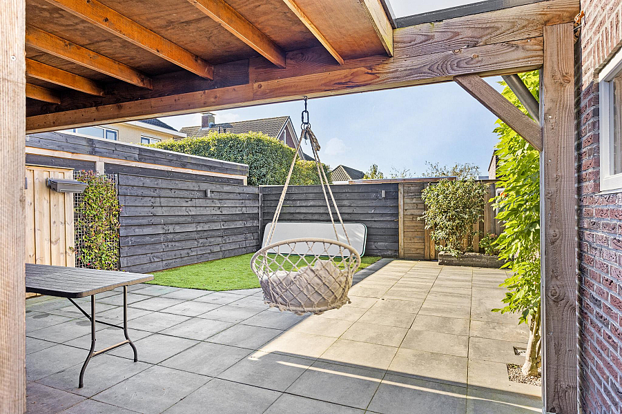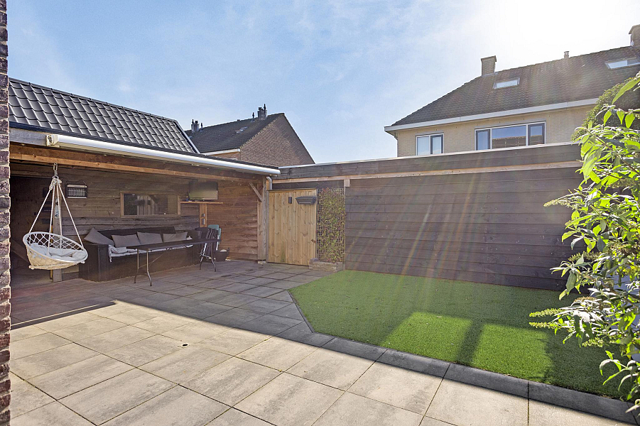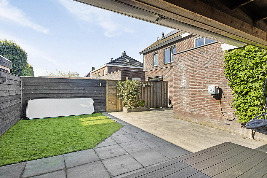 Via de dubbele openslaande deuren in de keuken bereik je de op het zuidoosten gelegen tuin. Deze is in 2023 opnieuw aangelegd met fraaie tegels, kunstgras en is voorzien van een houten berging met zolder en overkapping.