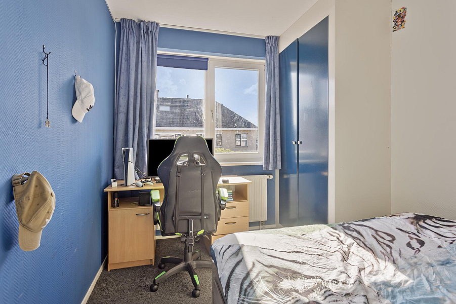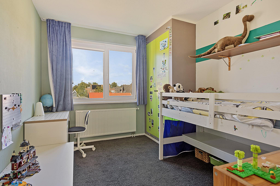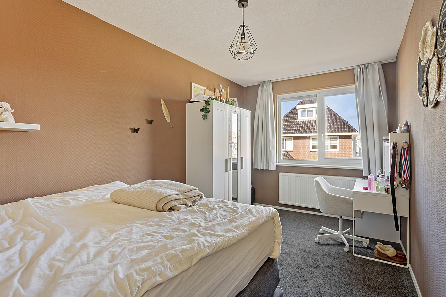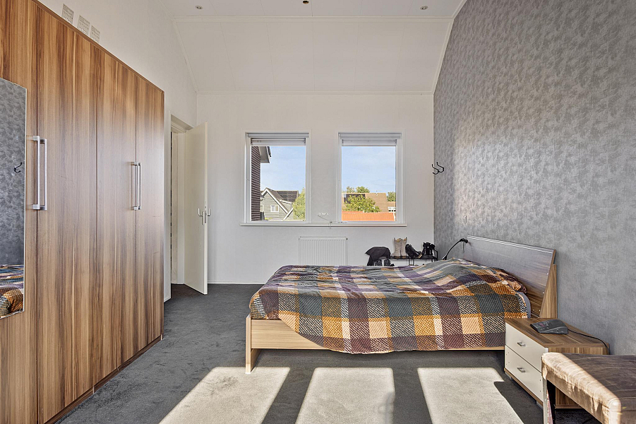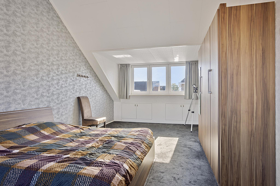 Overloop met toegang tot de vier slaapkamers, badkamer en trap naar de tweede verdieping. In 2018 is boven de garage de grootste slaapkamer gerealiseerd. Deze is voorzien van een dakkapel en bergruimte achter de knieschotten. De drie overige slaapkamers zijn allen tevens goed van formaat. De badkamer beschikt over een douche, tweede toilet en wastafelmeubel.