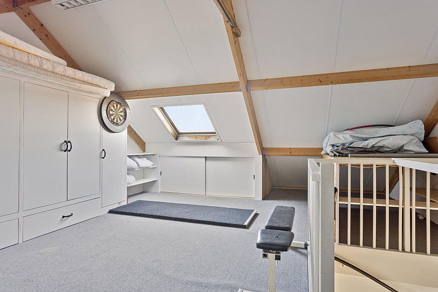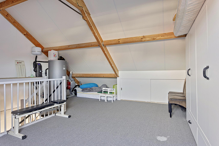 Open verdieping waar je eenvoudig een vijfde ruime slaapkamer kunt creëren. Op deze verdieping bevinden zich onder andere de Benraad CV ketel (2007), omvormer van de zonnepanelen en de zonneboiler (300 liter). Daarnaast is er bergruimte aanwezig achter de knieschotten.