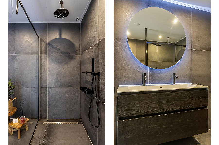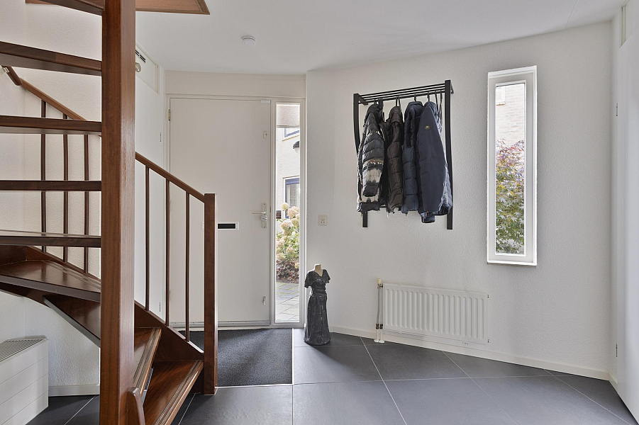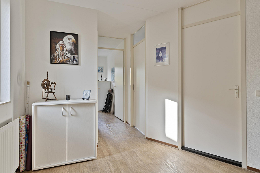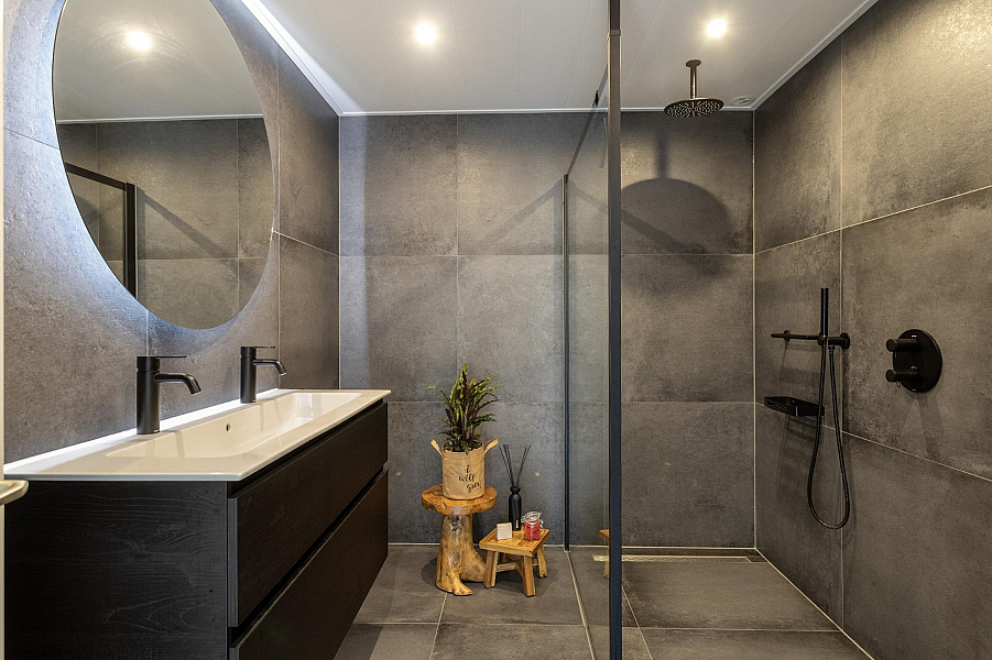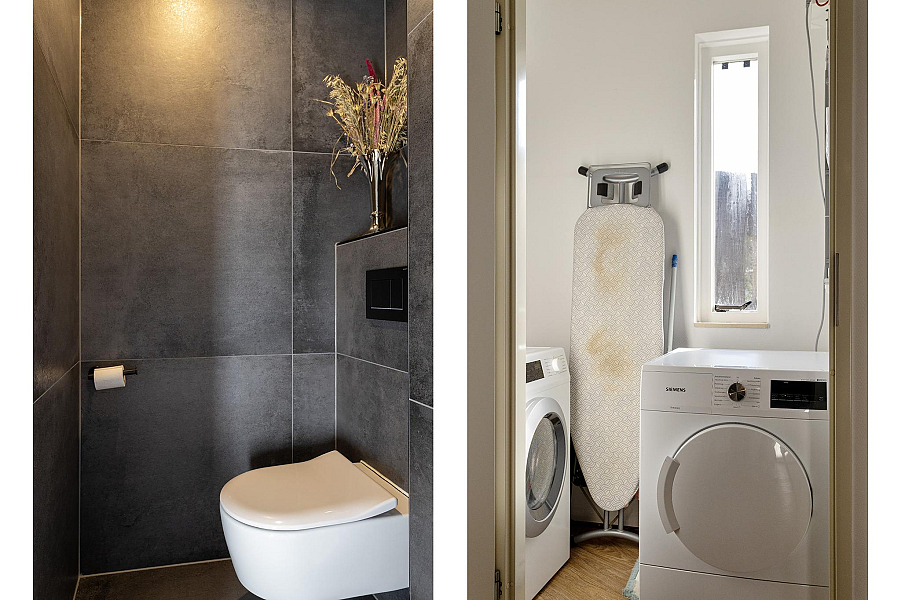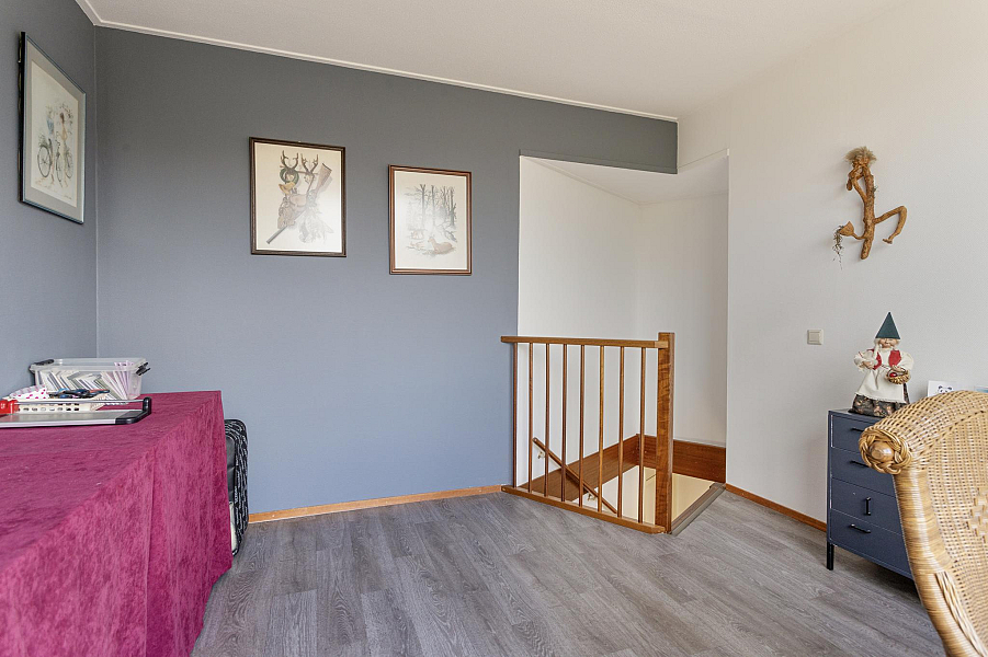 Zeer royale overloop met aparte toiletruimte, wasruimte met opstelplaats voor cv-ketel (Nefit 2014) en wasmachine, 3 royale slaapkamers en een in 2022 vernieuwde badkamer. De badkamer is voorzien van een inloopdouche met zwarte regendouche, dubbele wastafel en zwarte design radiator.