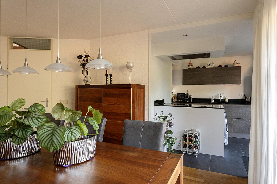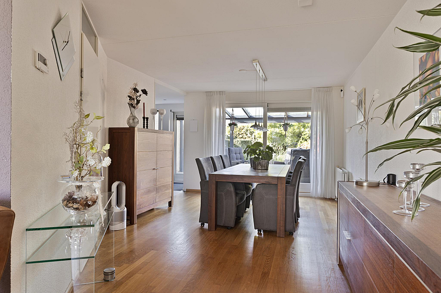 Riante entree/hal met trapopgang naar de eerste verdieping en toiletruimte, woonkamer met vrij uitzicht aan de voorzijde en ruim eetgedeelte met schuifpui naar de achtergelegen tuin. De in 2015 geplaatste keuken is van alle gemakken voorzien en beschikt over een vaatwasser, koelkast met vriesvak, inductiekookplaat, combimagnetron en afzuigkap. Vanuit de keuken heeft u toegang tot de keurig aangelegde tuin welke is gelegen op het westen, waardoor u de gehele middag tot het eind van de dag van de zon kunt genieten! De tuin is voorzien van een fraaie overkapping (2018) met verlichting en zonwering onder het dak van de overkapping en screens aan de voorkant, allen te bedienen met afstandsbediening. Aan de achterzijde van de woning bevindt zich de ruime garage, welke met ruim een meter is vergroot. Voor de garage beschikt u over uw eigen oprit.