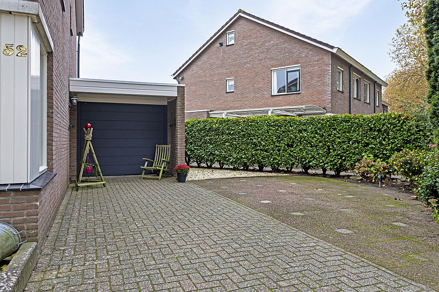 BEGANE GROND: Overdekte entree, hal met trapopgang naar de eerste verdieping, toiletruimte met toilet en fontein, straatgerichte woonkamer met fraaie parketvloer en een vrij uitzicht, de moderne open keuken is voorzien van inbouwapparatuur (o.a. 4-pits gaskookplaat, afzuigkap, combi-oven, koelkast en vaatwasser), doorgang naar de praktische bijkeuken met opstelplaats voor de wasmachine en de ruime garage welke is voorzien van een elektrische sectionaaldeur.
