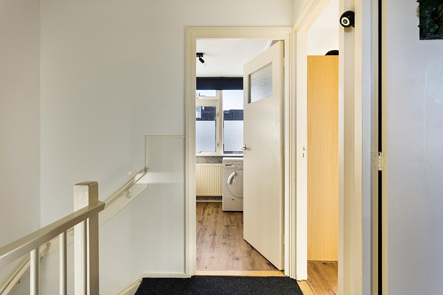 Eerste verdieping: Overloop met toegang tot de drie slaapkamers en de gloednieuwe badkamer. De drie slaapkamers zijn allen goed van formaat. De moderne badkamer is voorzien van een douche, en wastafel. Vanuit de hal heeft u tevens via de vlizotrap toegang tot de zolder.