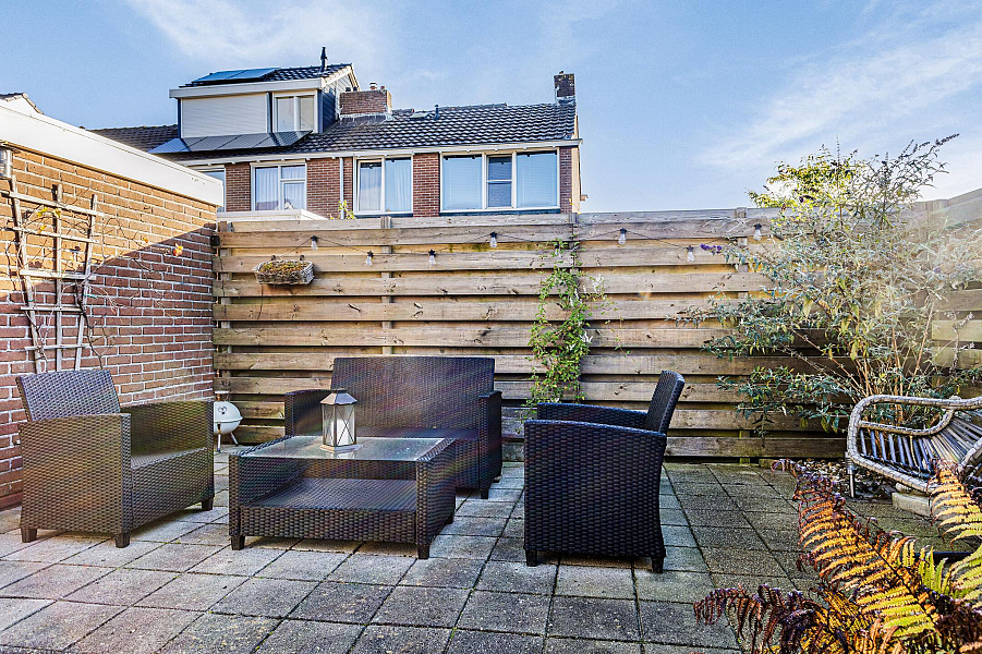 De achtertuin is gelegen op het oosten. Maar door de gunstige hoekligging kun je de gehele dag genieten van de zon! In de tuin vind je een stenen berging, ideaal voor fietsen, tuingereedschap of als hobbyruimte. Daarnaast is er een houten berging naast de woning, perfect voor extra opslag of klusjes.