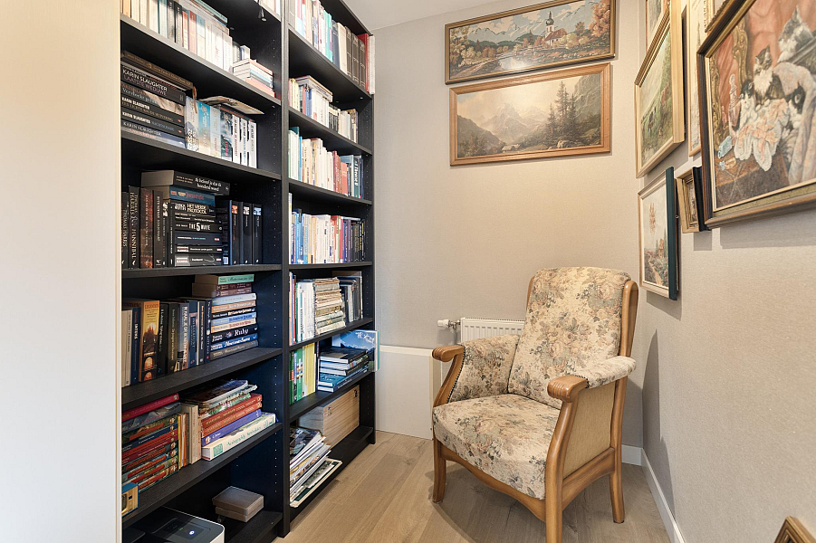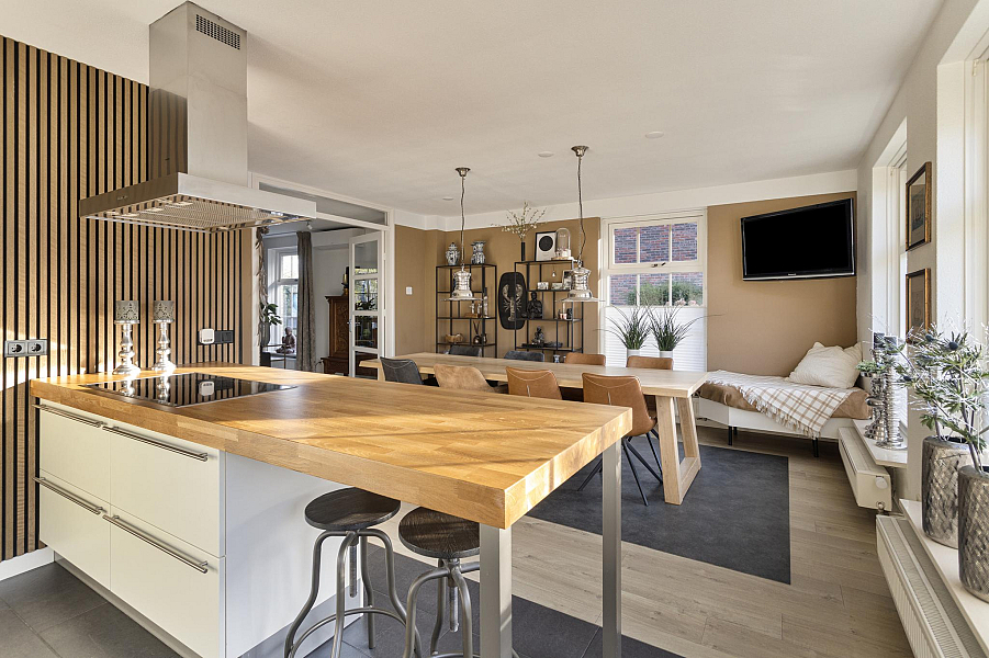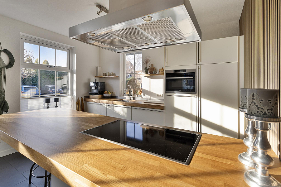 BEGANE GROND: Ruime entree/hal met trapopgang naar de eerste verdieping, toiletruimte met hangend toilet en fontein, riante straatgerichte woonkeuken met veel lichtinval. De keuken met kookeiland is voorzien van de volgende, recente inbouwapparatuur: inductiekookplaat, afzuigkap, combi-oven, koelkast, vaatwasser en Quooker. Keuken en woonkamer zijn te scheiden middels de openslaande deuren. De woonkamer is tuingericht en beschikt over een heerlijke houtkachel en openslaande deuren naar het overdekte terras, een glazen deur naar de aangebouwde werkkamer van 22 m2 en knusse bibliotheek. Deze werkkamer is zeer geschikt voor het realiseren van een slaapkamer en badkamer op de begane grond.