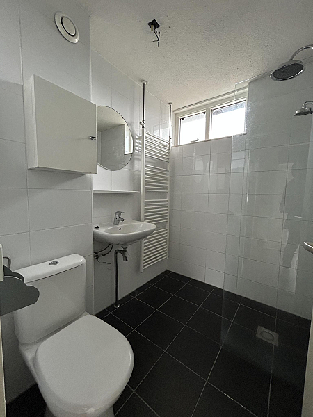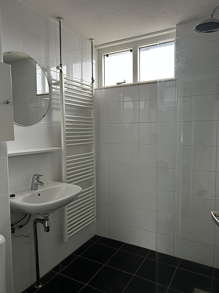 1E VERDIEPING: Overloop, 3 goede slaapkamers (9 ,10 en 12 m2), badkamer met vaste wastafel, douchehoek en 2e toilet, vaste trap naar...
