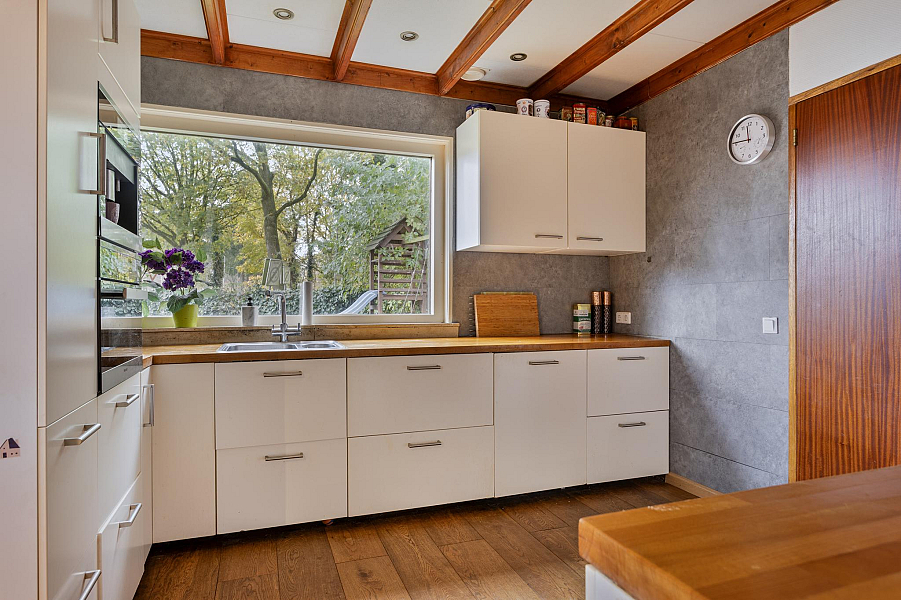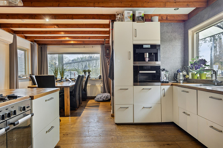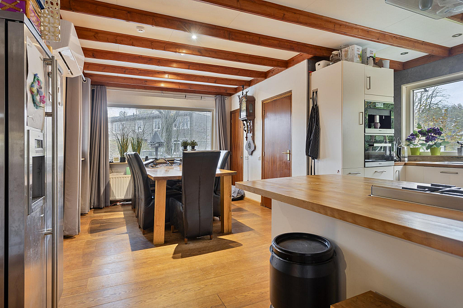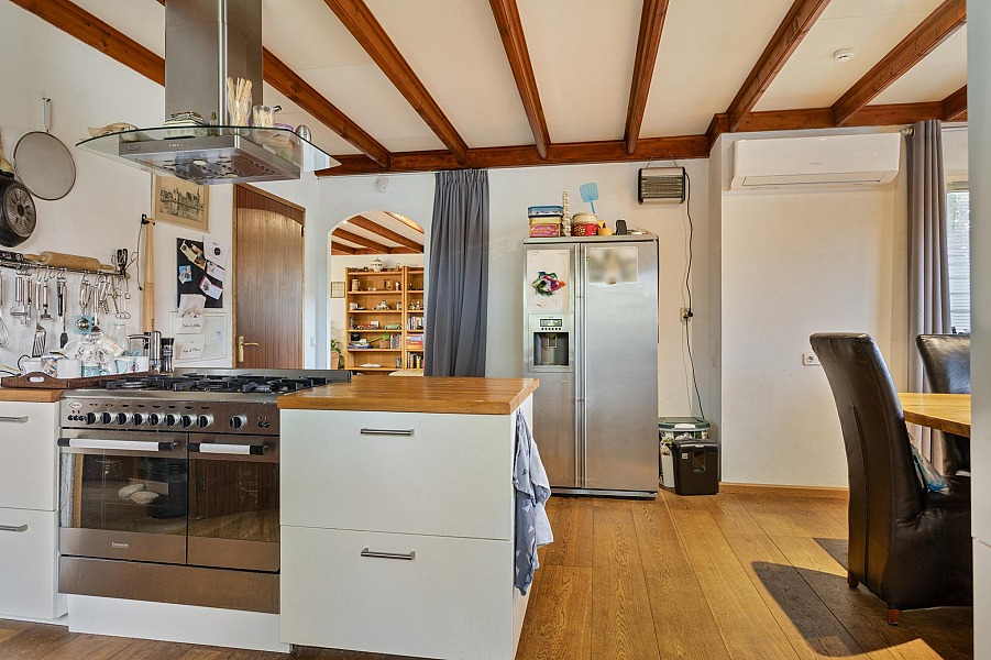 De woonkeuken is v.v. een uitgebreide keukeninrichting met 6-pits gasfornuis met oven, Amerikaanse koelkast (t.o.n.), vaatwasser, magnetron en koffiezetmachine.