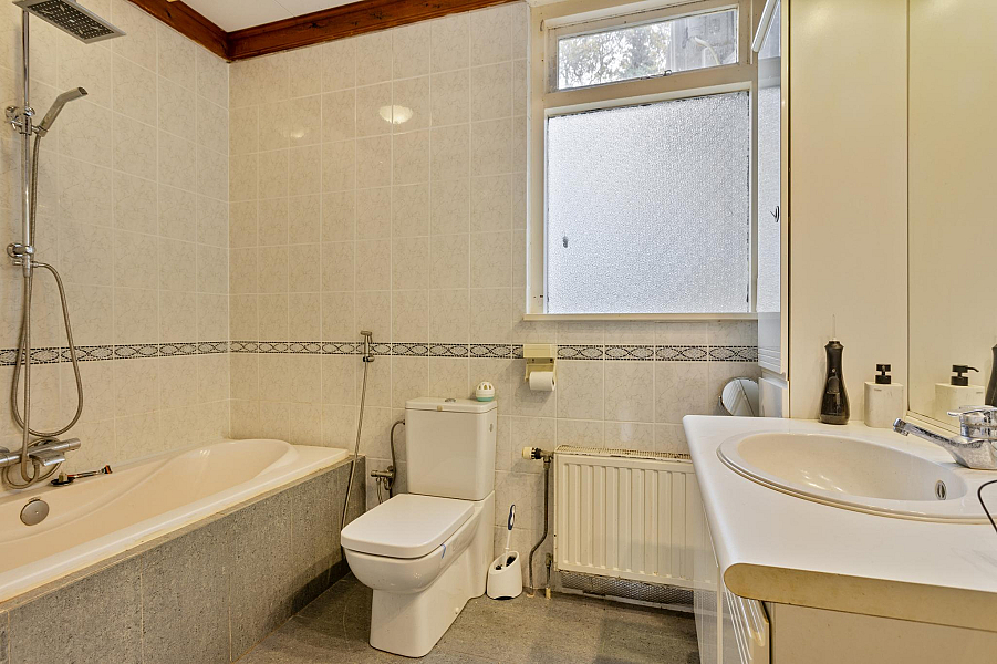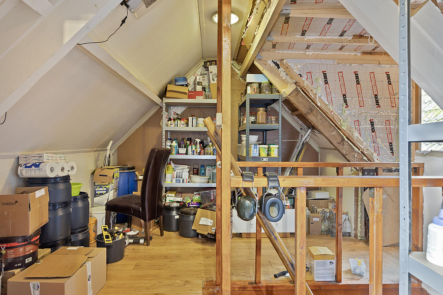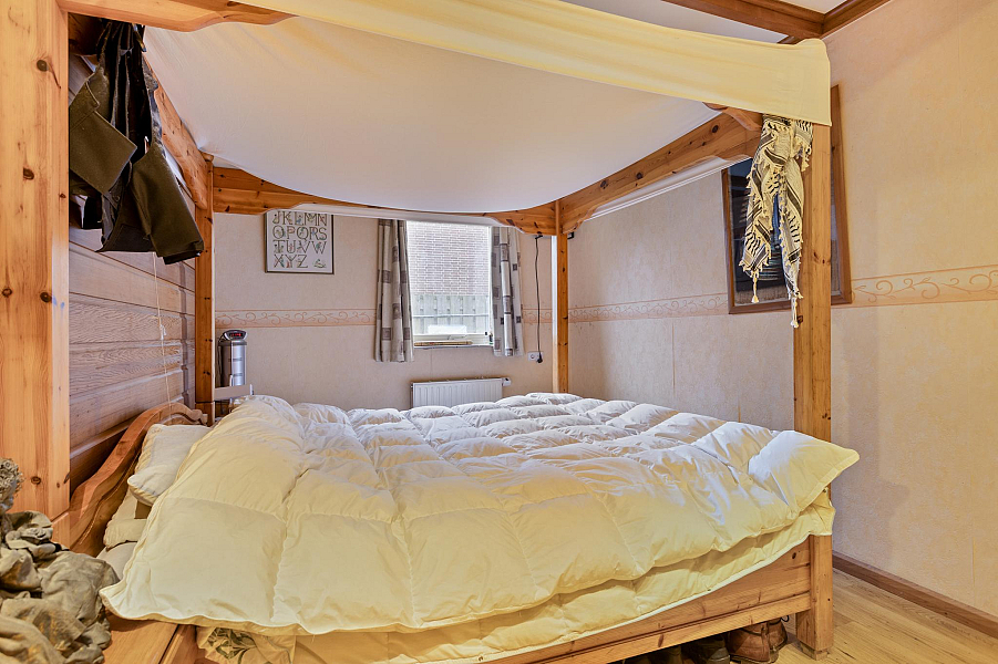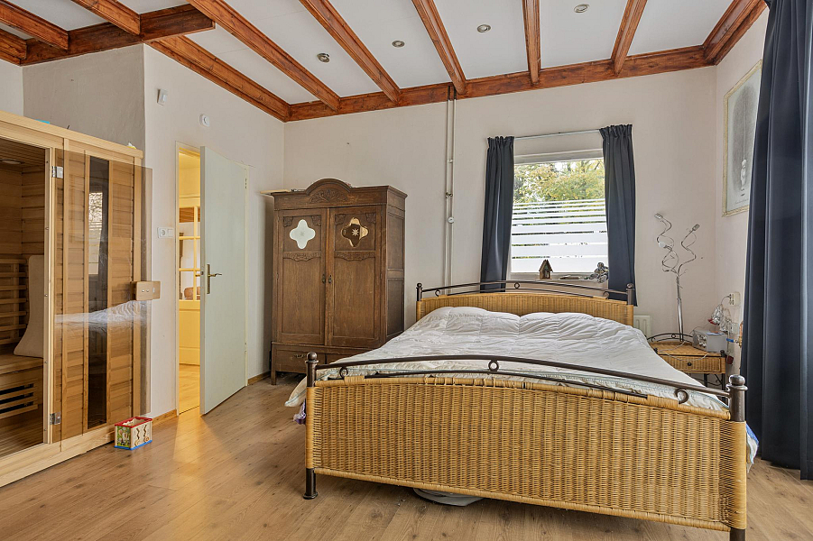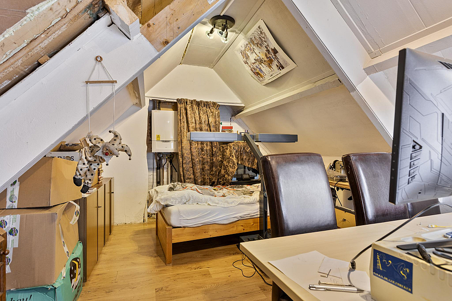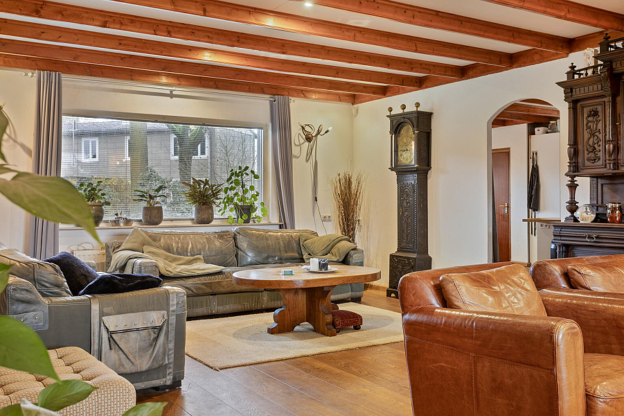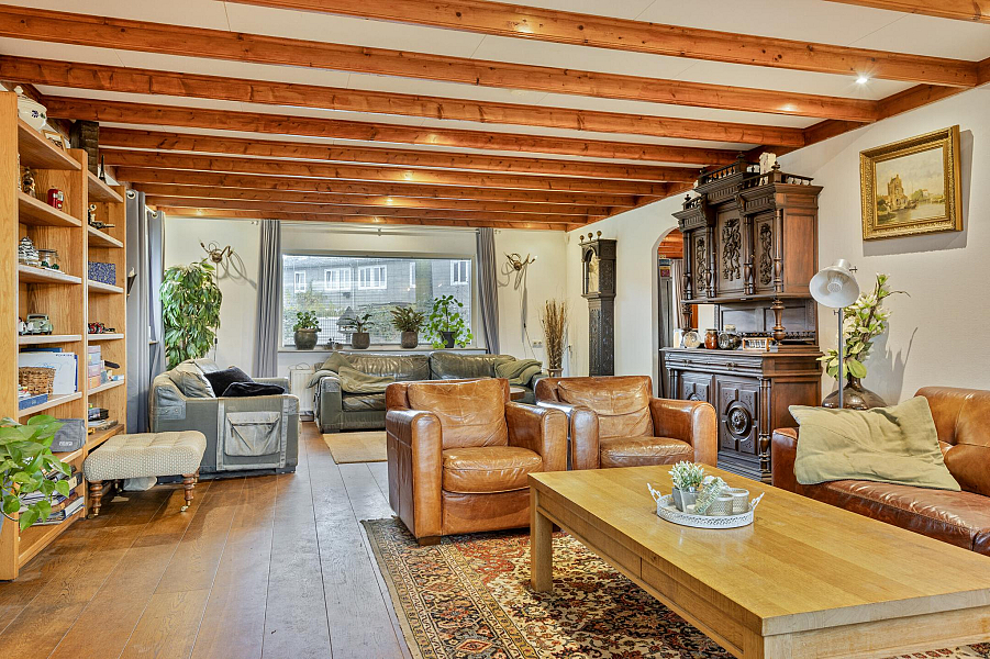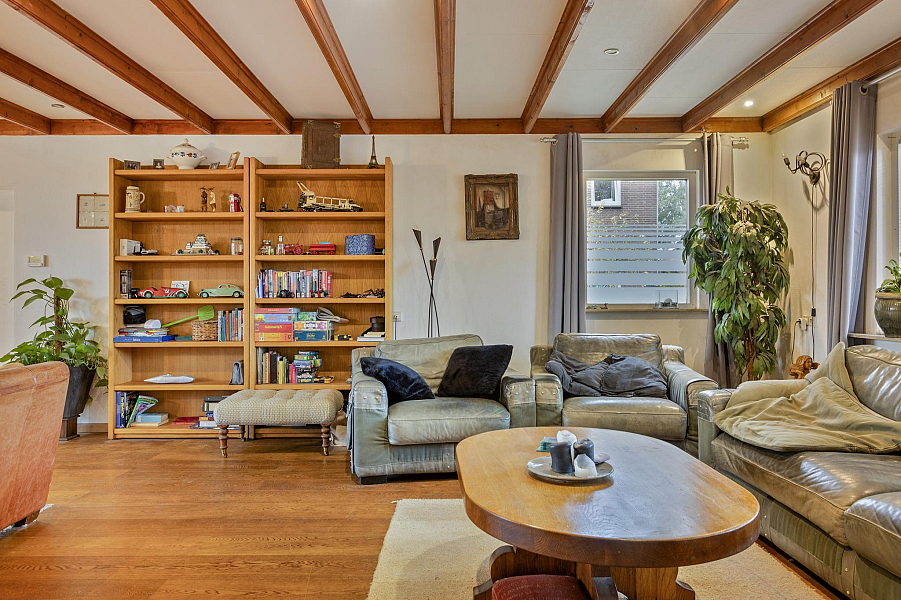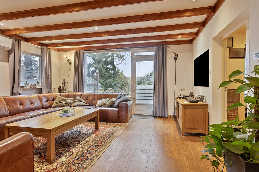 Aansluitend aan de woonkeuken is te midden van de woning een mooie royale woonkamer met eiken vloerdelen en deur naar de tuin aanwezig. In het voormalige kantoor zijn nu twee mooie slaapkamers gesitueerd, waar eenvoudig een gescheiden woonruimte of kantoor van is te maken.