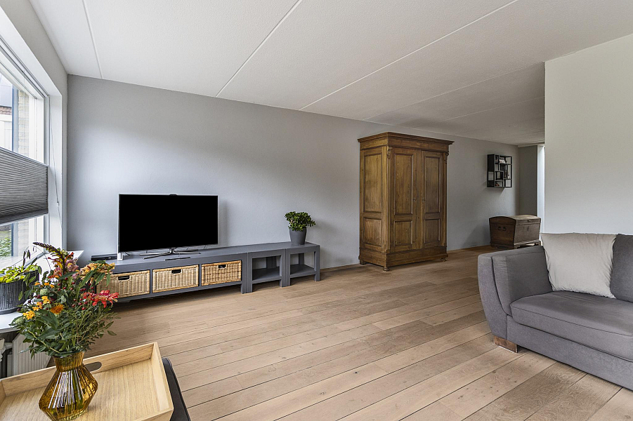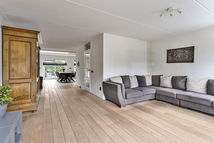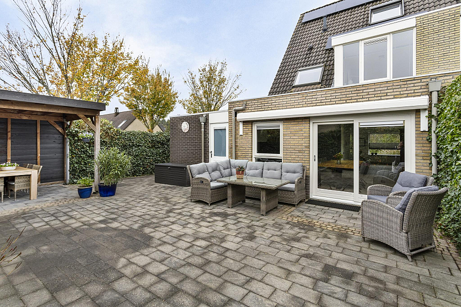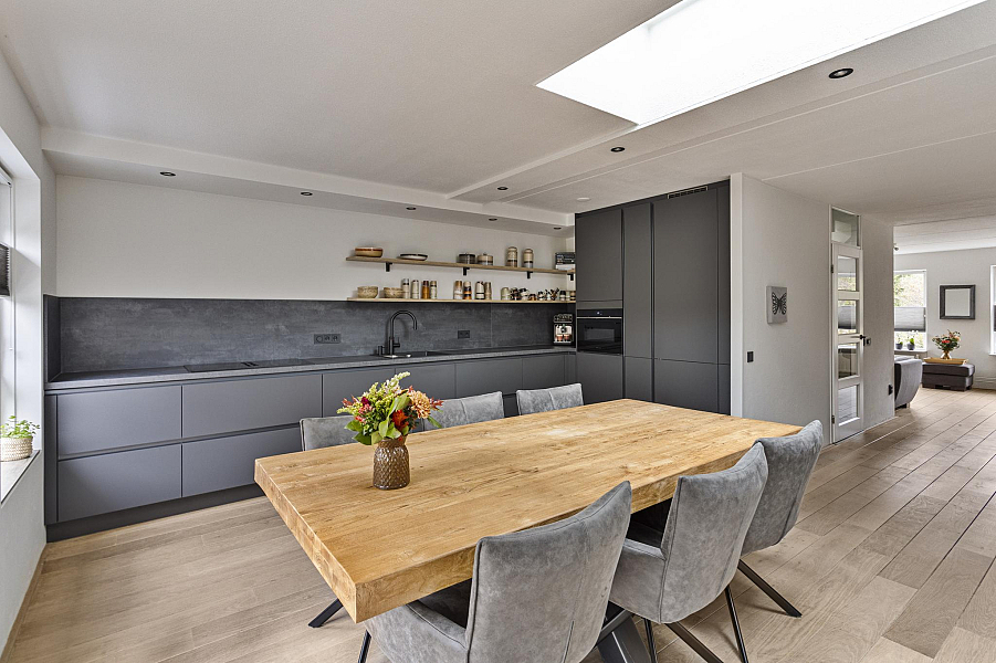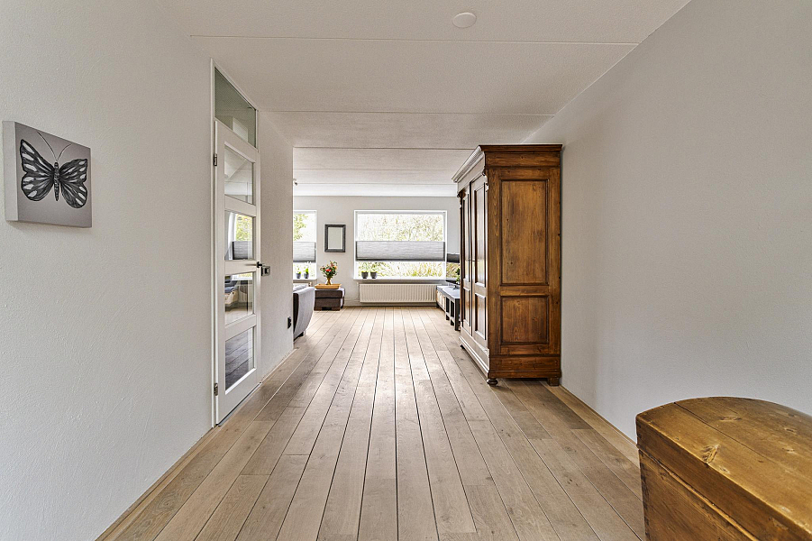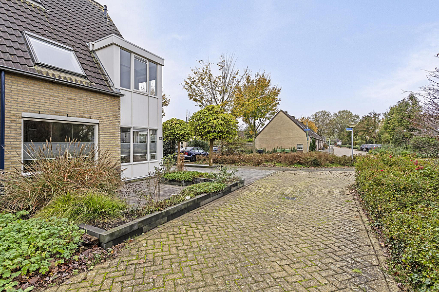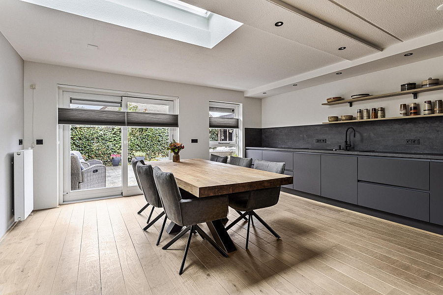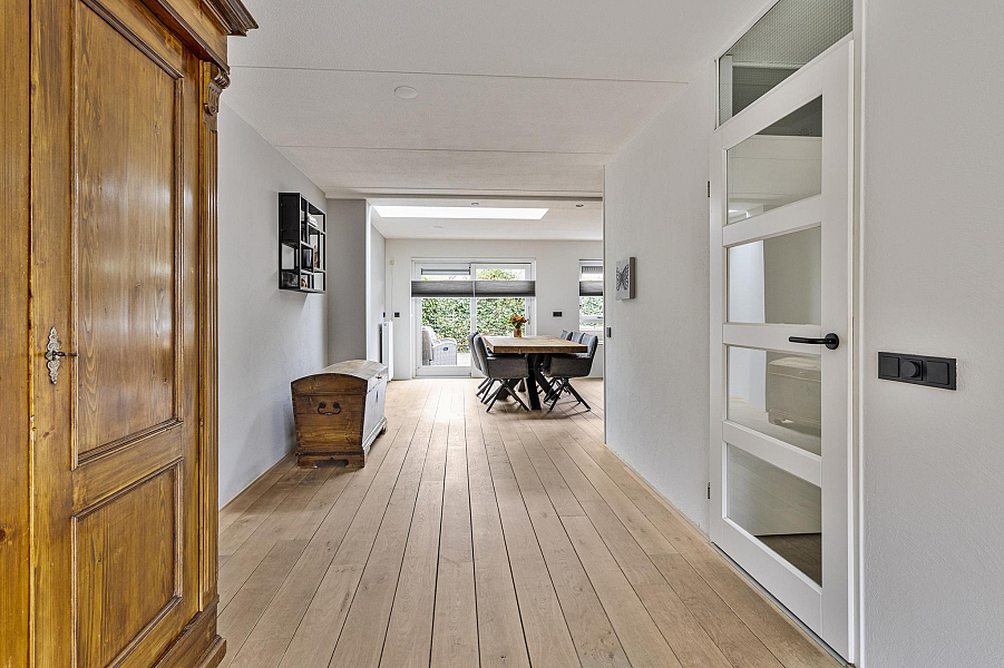 BEGANE GROND: Overdekte entree, hal met meterkast, trapopgang naar de eerste verdieping en vernieuwde toiletruimte met hangend toilet en fontein, lichte woonkamer welke is voorzien van een eiken parketvloer, de riante woonkeuken uit 2023 met lichtstraat maakt deze verdieping compleet. De keuken is voorzien van uitgebreide inbouwapparatuur (o.a. inductiekookplaat met ingebouwde afzuiging, grote koelkast, vaatwasser, Quooker, combi-oven) en schuifpui naar de zonnig gelegen achtertuin.
