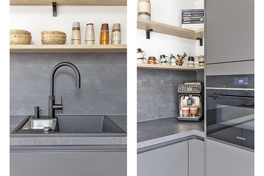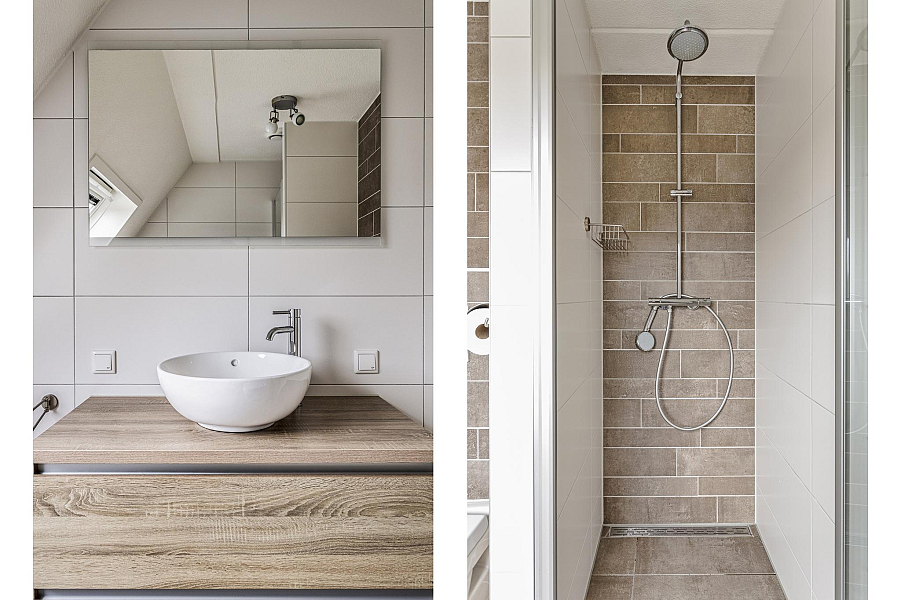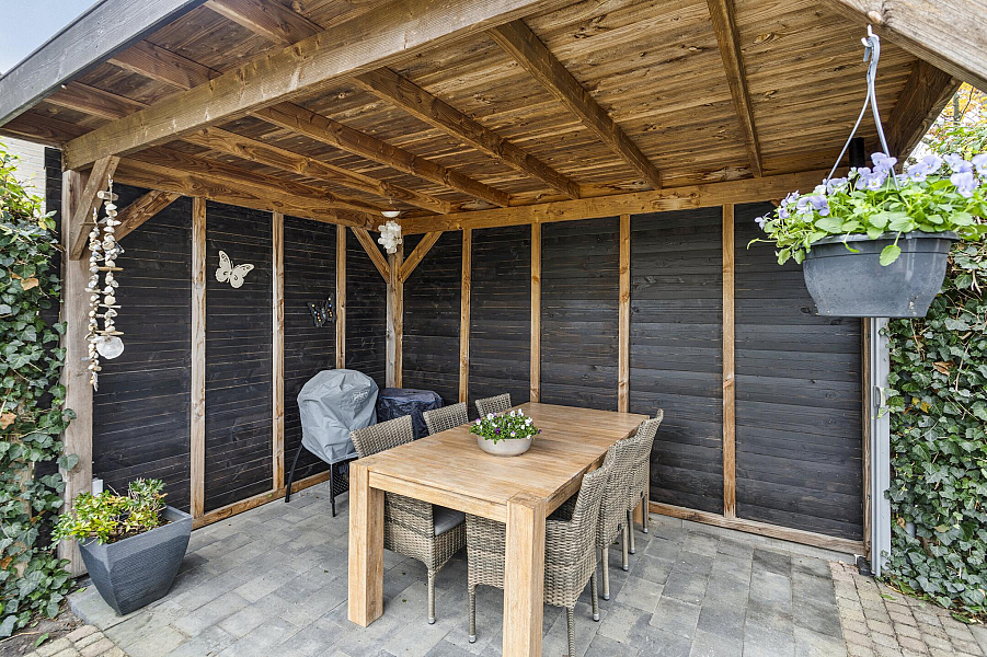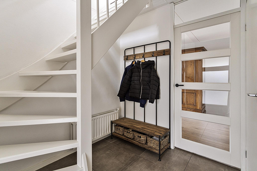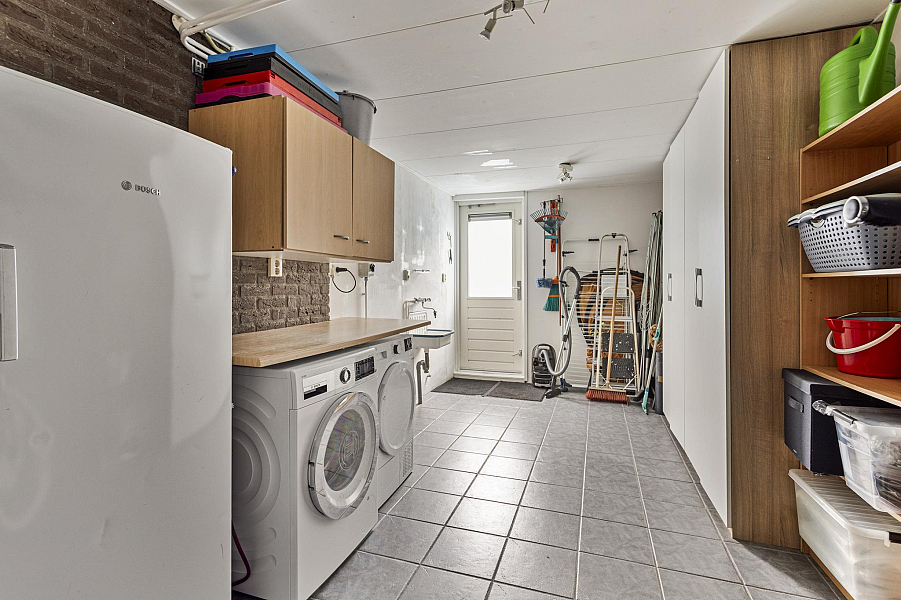 Vanuit de hal is ook de aangebouwde garage/berging bereikbaar; hier vinden o.a. de wasmachine en droger een plekje.